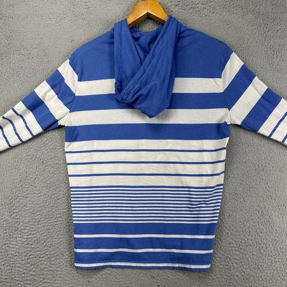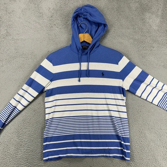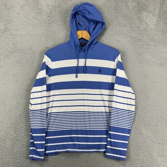 Polo Ralph Lauren Mens Hoodie Sweatshirt Small Blue White Stripe Drawstring PonyChest measures 38 inches and the length is 25 inches.Features:* Hoodie SweatshirtSize: Mens SmallCondition: Pre-Owned GoodGood condition with light wash wear.- We do our best to describe all items accurately if we miss something please let us know and we will make it right.- We ship within one business day.- Please review measurements shown in the pictures to insure a great fit. day.Clothing items: All used clothing has been laundered per the manufacturers instructions.