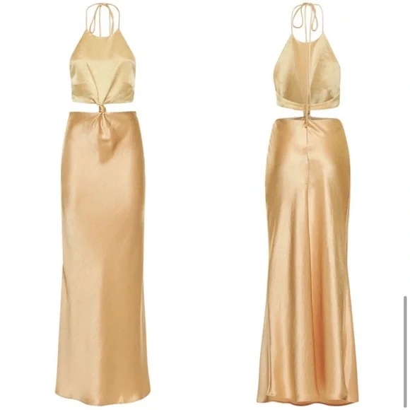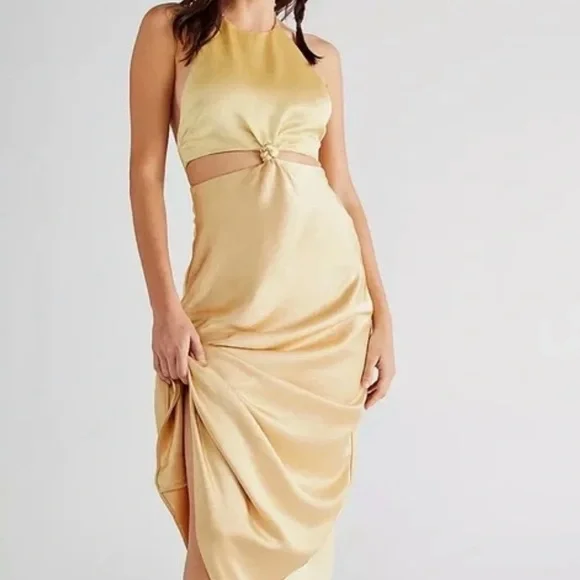 Turn heads in this forever timeless maxi dress featured in a halter-inspired style and gorgeous silky fabrication with tie detail at center and cutout sides for added dimension.Brand New w/Tag*Halter-Style Neckline*Tie Closure at Back Neck*Hidden Back Zip Closure*Lined*Bias Cut*Silky Fabrication*Polyester*Dry Clean*AustraliaApproximate Dress Length:58"Inquire about additional measurementsUSA Size: 2 | XS (Australia Size: 6)USA Size: 6 | Sm(Australia Size 10)Product label has a mark to indicate that item cannot be returned to the retail storeTags: atreasuretrove, Contemporary, Minimalist, Victorian, Romantic, Ethereal, Feminine, Boho, Bohemian, Vintage, Gypsy, 70s, 80s, 90s, Retro Inspired, Cottagecore, Prairie, Princess, Luxury, Luxe, Feminine, Wistful, Ruffles, Flowy, Floral, Solid, Lace, Chiffon, Mini, Midi, Maxi, Gown; Party, Special Occasion, Formal, Prom, Homecoming, Wedding Guest, Bridal, Engagement, Photographs, Pics, Pictures, Rehearsal, Destination, Date Night, Cocktail Party, Travel, Honeymoon, Cruise, Beach, Resort, Travel; Bec + Bridge, Free People, FP Beach, LoveShackFancy, Revolve, Shopbop, Anthropologie, For Love and Lemons, Farm Rio, Lilly Pulitzer, Johnny Was, Fillyboo, Cecilia Prado, Ralph Lauren, Tommy Hilfiger, Boden, Nicholas K, Jen's Pirate Booty
