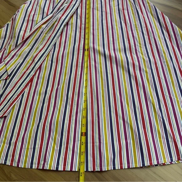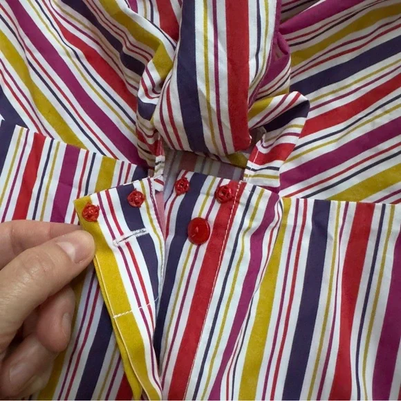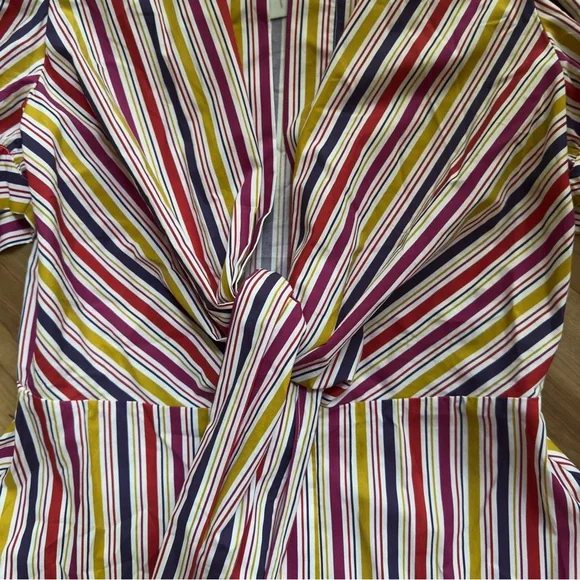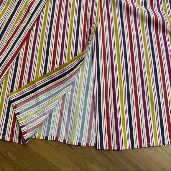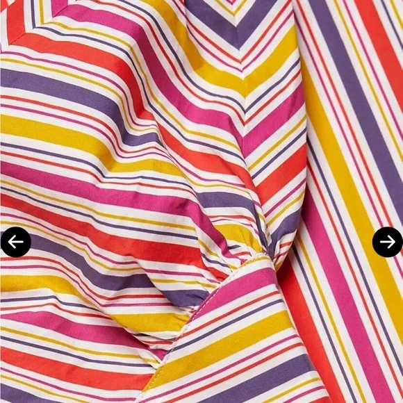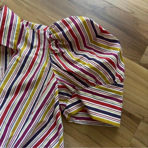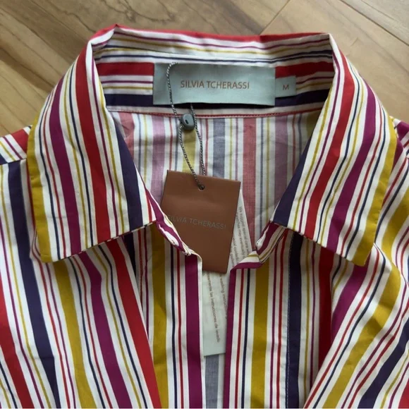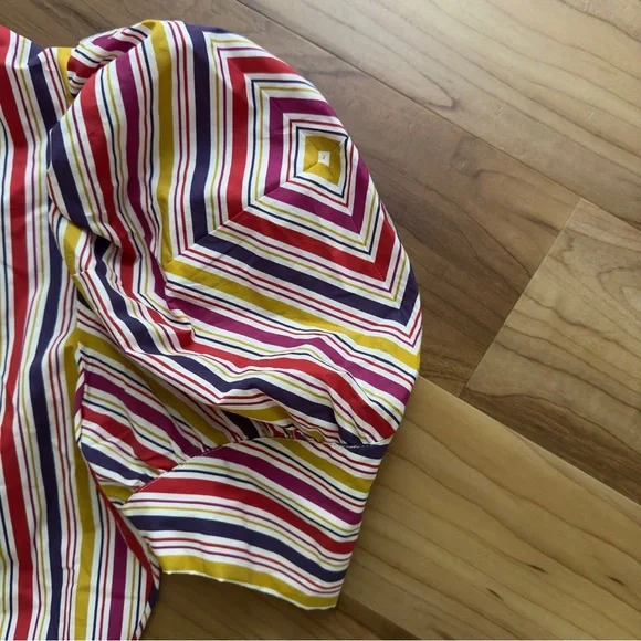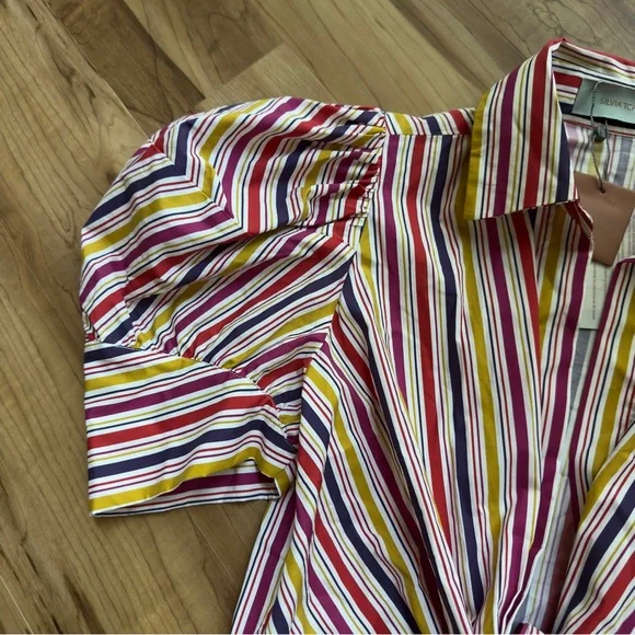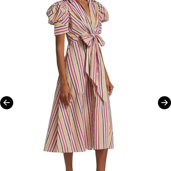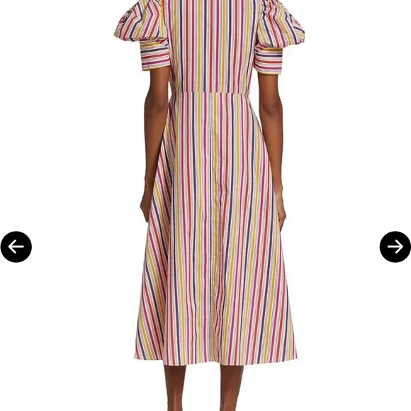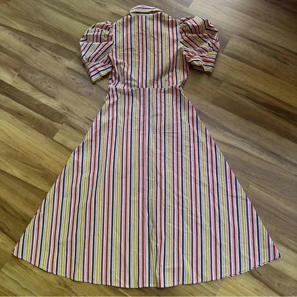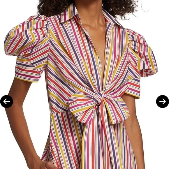 NWT Silvia Tcherassi's Roopal midi-dress is tailored with a spread collar and plunging neck finished with a dramatic bow.Crafted of cotton, this striped style features short puff sleeves adding to its playful design. White dress with yellow, pink, red, purple stripes! Spread collar Short sleeves - exaggerated puffed Banded cuffs Front self-tie Side slit pockets Bold vertical stripesTailored flared twirl skirt100% cotton Open to reasonable offers. Sold as is. No returns or refunds. Please review all pictures. Tropical fun carnival festival vibrant colourful citrus jewel tones symmetrical geometric artistic creative wedding party cocktail engagement European Italian French Spanish Brazil Miami yacht boat quiet luxury miosotis