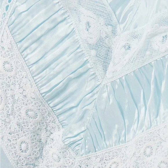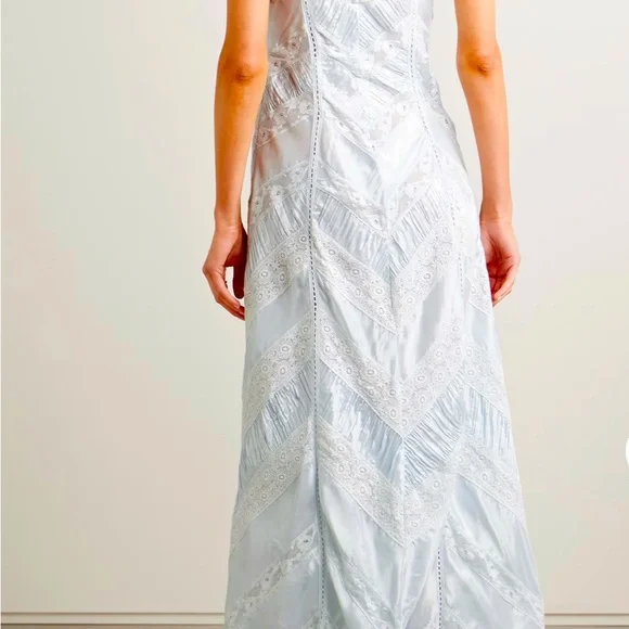 Purchased for $795, now sold out online in this size. Wore only once for less than 2 hours. Perfect condition. Had one inch taken off the length, but no other alterations. I’m 5’3” and wore 2 inch heels.Made from panels of light-blue satin and cotton-lace, it has fully adjustable straps and a crepon lining. Lightweight fabric. True to size.