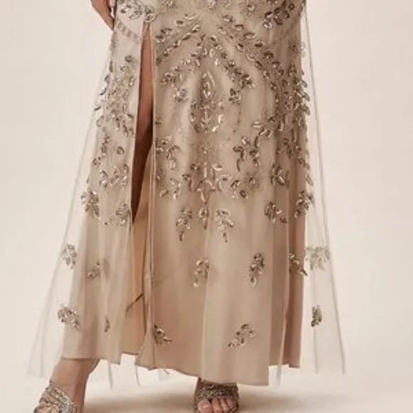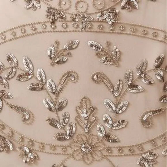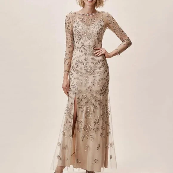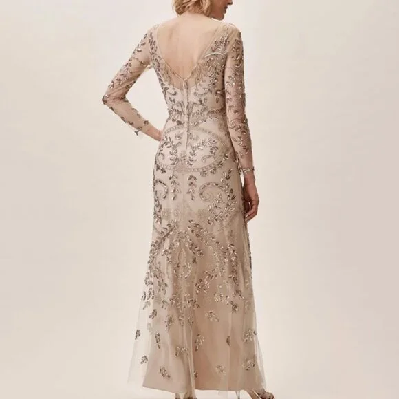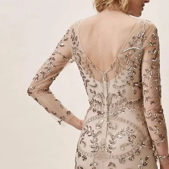 Anthropologie BHLDN Orva Dress NewA glamorous gold sequined overlay tops an ultra-comfortable stretch lining. The illusion neckline and sleeves paired with a front slit are a subtly sexy touch. Never Worn beautiful dress, I had to size up. I am 5'4 and 165 pounds, 38 DD, I normally wear a size 10/12 but had to size up to get the right fit. Stretchy underlining that is separate from the top sheet overlay. This is beautiful and has perfect coverage highlighting figure but hiding all those areas we want to cover. Highly recommend.Polyester; polyester liningBack zipProfessionally cleanColor Champagne and GoldSize 12Approximate measurementsPit to pit 20”waist 17” flathip 23”Available to ship now