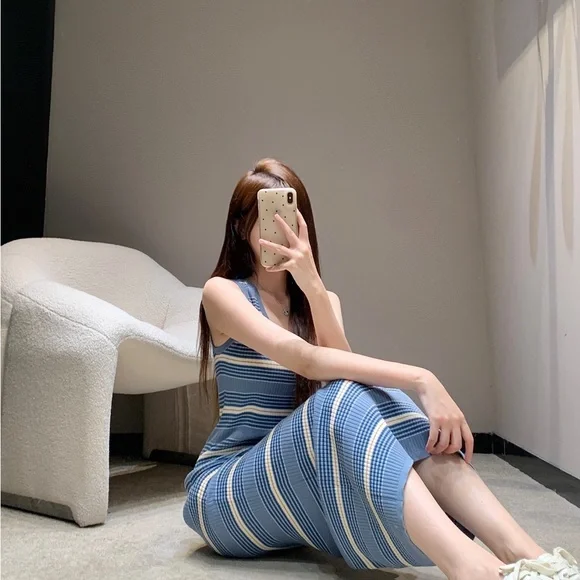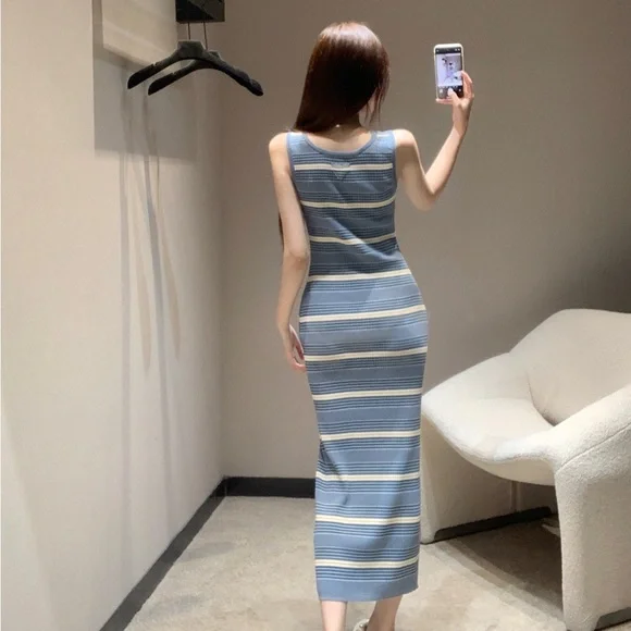 This Prada dress is a stunning sleeveless bodycon maxi, featuring a ribbed texture in alternating blue and gray hues. The scoop neckline adds a touch of elegance, making it perfect for casual outings. Its form-fitting design ensures a flattering silhouette, ideal for those who appreciate both style and comfort.