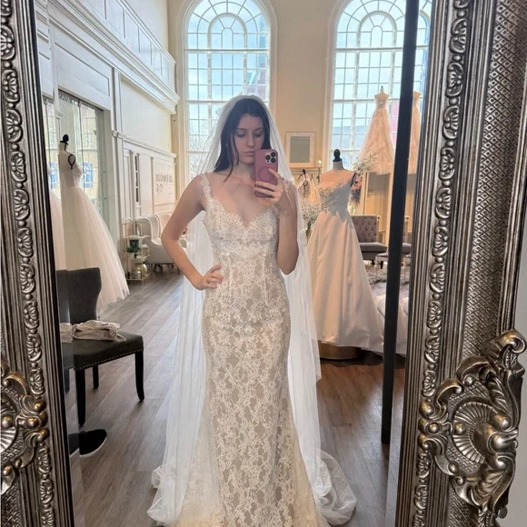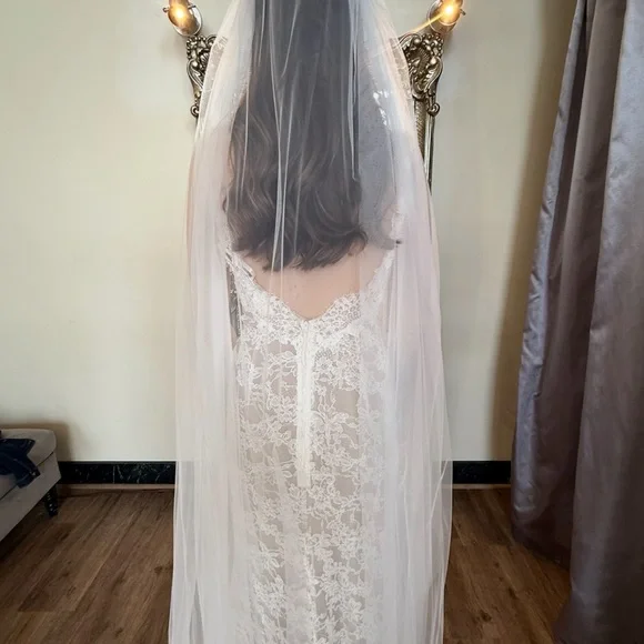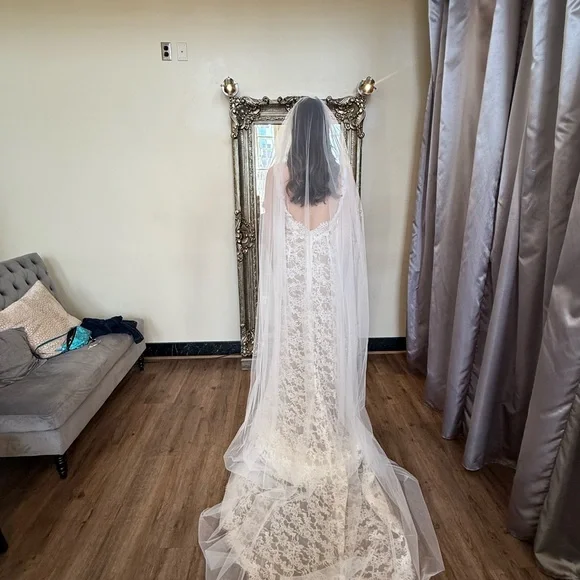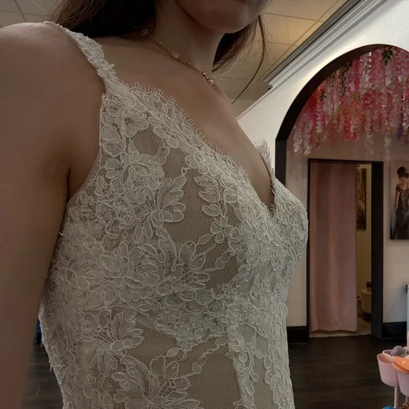 This elegant wedding gown in a soft cream hue features a sleeveless design with a sophisticated V-neckline. The dress is adorned with intricate lace patterns, showcasing floral and geometric motifs that add texture and dimension. A sheer overlay drapes gracefully from the shoulders, enhancing its romantic and ethereal charm.