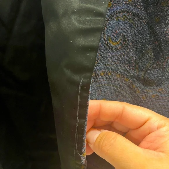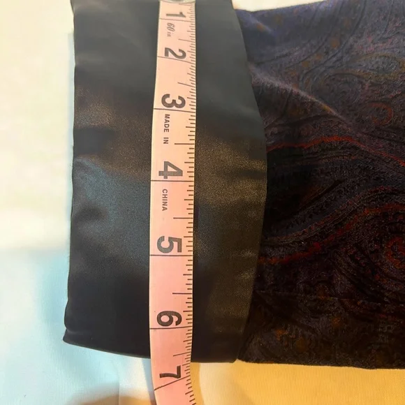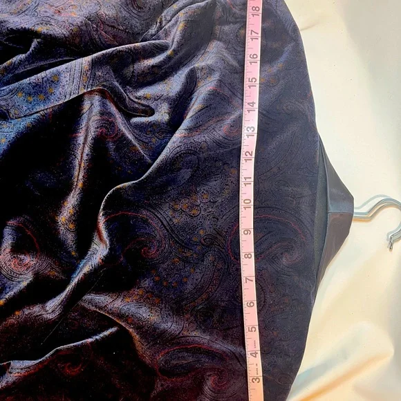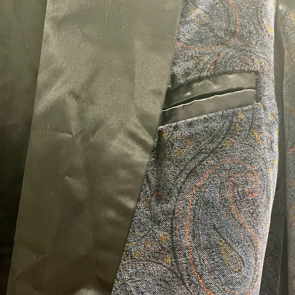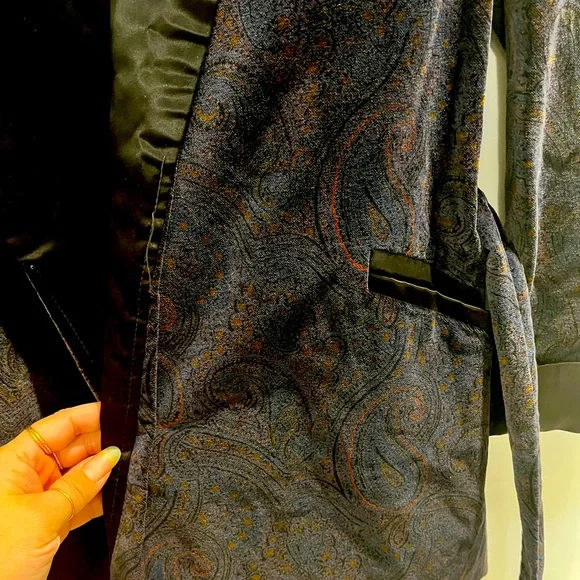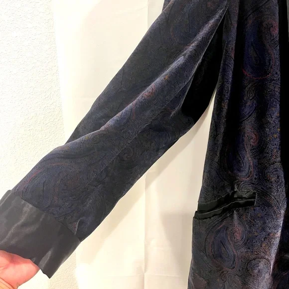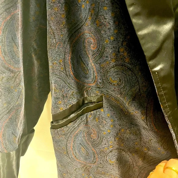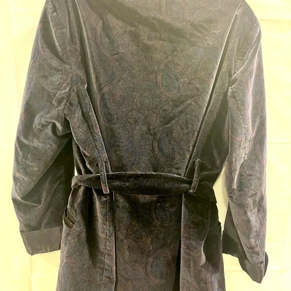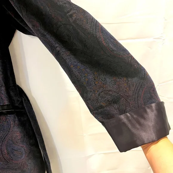 Paul Stuart 100% cotton paisley jacket with belt. Possibly custom made as size is not available. But measurements are in picture. Shoulder to shoulder is 19.5 inches, sleeves are 24.5 inches, from collar to bottom is 34 inches. Estimated size is medium. Black collar and black lined sleeves and pockets.