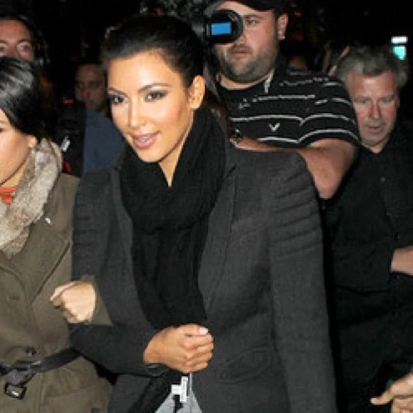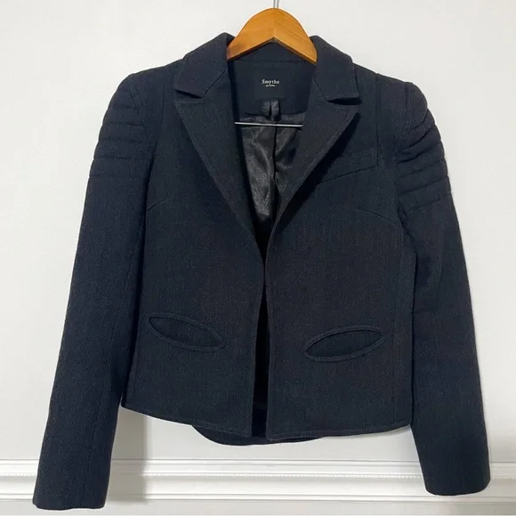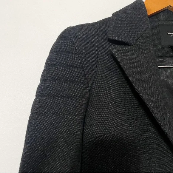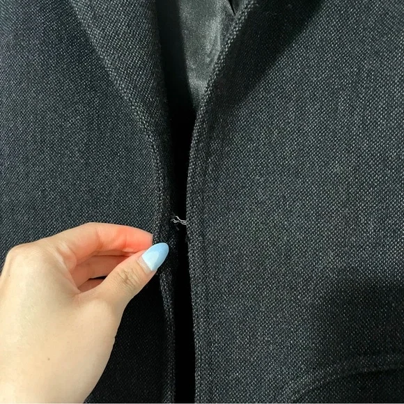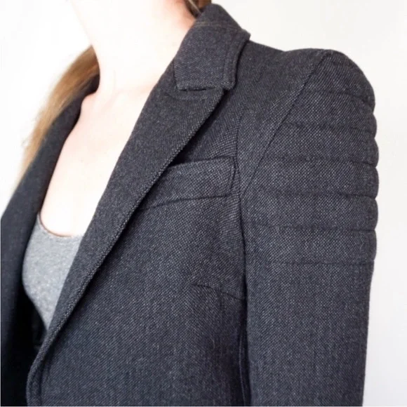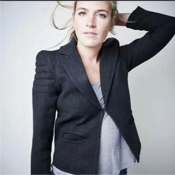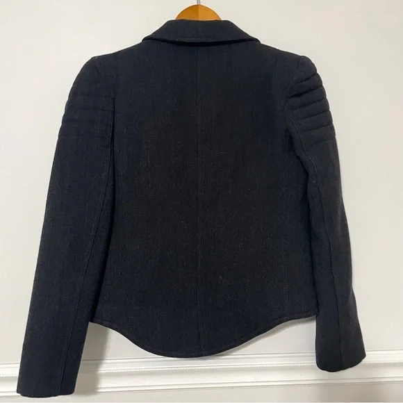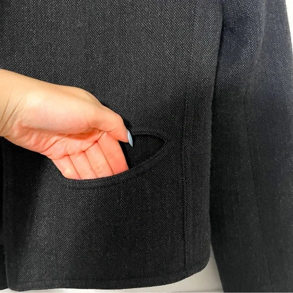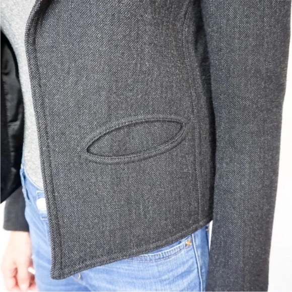 Excellent preowned condition No noted flaws Please see measurements below for sizing - Pit to Pit: 19”Waist: 17”Shoulders: 17.5”Length: 22.5”Pit to End of Sleeve: 17”Fabric: 97% Wool, 3% Cotton; Lining 97% Polyester, 3% ElastaneBlackPointed CollarSlit Pockets & Hook and Eye ClosureAs seen on Kim Kardashian & Bethenny Frankel