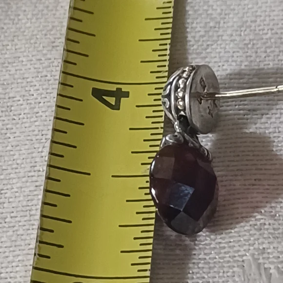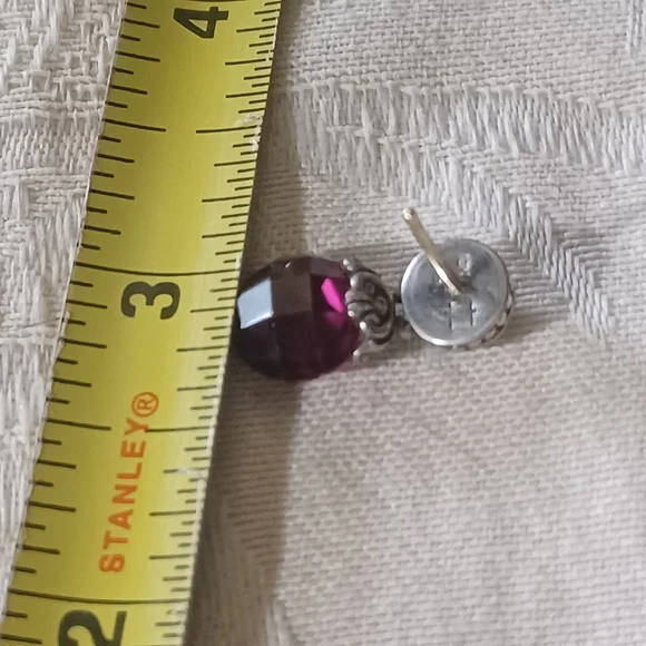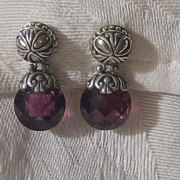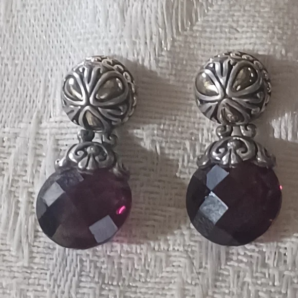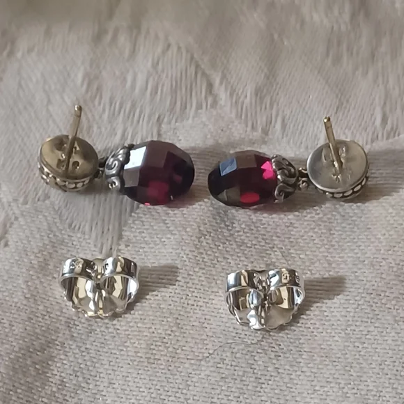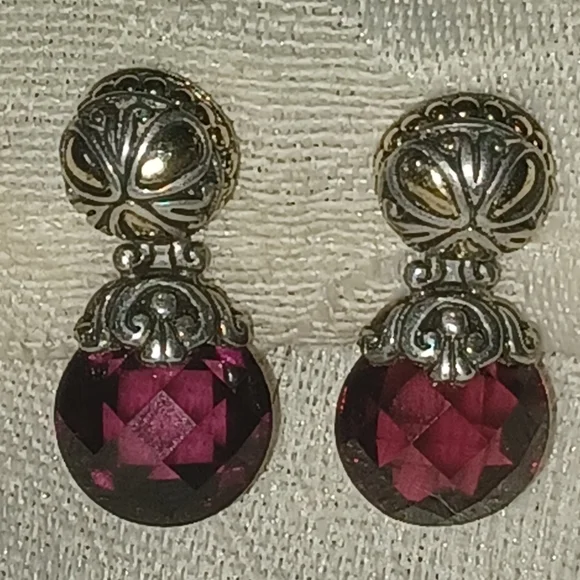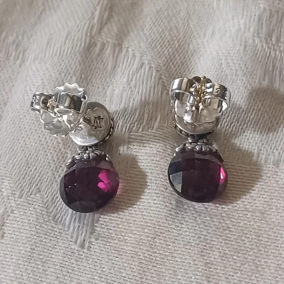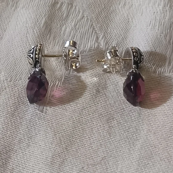Beautiful John Hardy Sterling Silver 18K Yellow Gold Rhodolite Garnet Drop Earrings. The earrings are crafted of sterling silver and 18 karat yellow gold and feature a Batu Kawung drop design with a faceted rhodolite garnet stone.The 18k details are in the beaded design. These have 18k posts and brand new JH sterling butterfly backs. These earrings are about 3/4 inch drop with the garnet at 1/4 inch. Each earring is stamped on the back with 18k, 925, and JH. These are in very good pre-owned condition and could use a but of polishing.