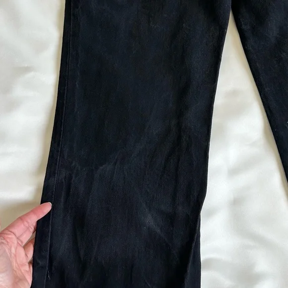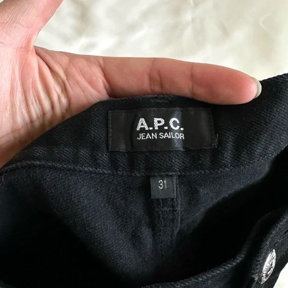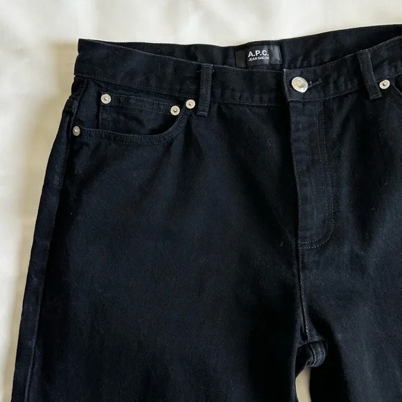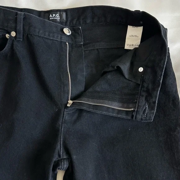 A.P.C Sailor Jean Classic Black Denim Straight Leg Fit Size-labeled 31~msrp $320Classic Vintage-style denim jeans with mid rise fit and flattering cropped straight cut leg. Perfect staple pair to style with everything!Preloved, some visible color fade wear and creasing throughout the leg (see photos) otherwise the jean is in great shape!Size: labeled 31laying flat-waist across 15.5"hips across 20"rise 10.5"inseam 27.5"length 39"Detailscolor: solid blackzip/button closurestraight leg mid rise100% cottonTags: luxury denim jeans black denim jeans apc jeans sailor jeans designer jeans black denim straight leg jeans carharrt levis mens jeans apc sailor jeans levis mens jeans essential jeans capsule wardrobe japanese denim jeans vintage style french style brand denim jeans apc mens jeans apc womens jeans cropped ankle japanese jeans vintage style