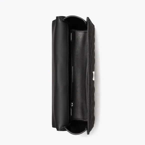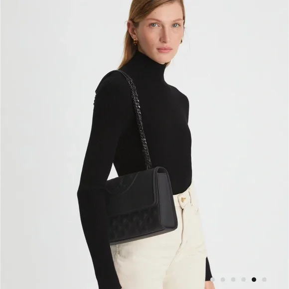 FLEMING MATTE CONVERTIBLE SHOULDER BAGThe new Fleming. Bolder quilting and chain. Set against refined details and construction. Our shoulder bag is a matte design with diamond quilting and an embossed bombé Double T. The strap, now with a double shoulder guard for comfort, is braided with tonal chain. It’s convertible, so you can wear it short or long.Holds an 8" tabletRubberized PUFlap with magnetic snap closureAdjustable metal chain strap with 22.5" (56.5 cm) drop. Leather double shoulder guard for comfort.1 exterior slit pocket; 2 interior slit pocket, 1 zipper pocketRemovable tasselMay be carried as a shoulder bag or crossbodyDust bag includedHeight: 7.2" (18 cm); length: 10.8" (27 cm); depth: 3.3" (8.3 cm)Style Number 82559Barely used, great condition. One very small snag on top of logo. Almost unnoticeable in person.Includes dust bag an Tory Burch notebook. Smoke free pet friendly home.