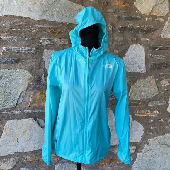 Aqua blue windbreaker hooded jacket. The jacket has zippered side pockets. The hood has elastic around it to draw it close to your face to help against windy days.Last picture shows a spot on the front of the jacket that’s not very visible as seen in first picture