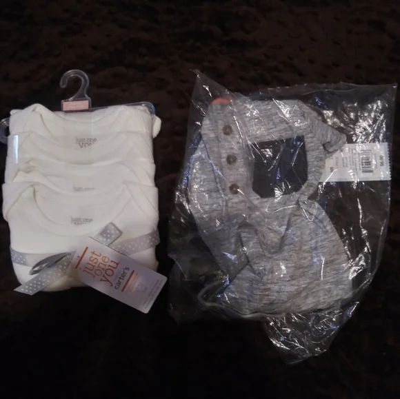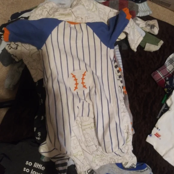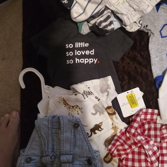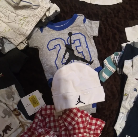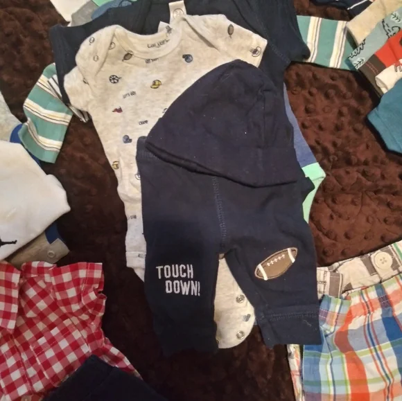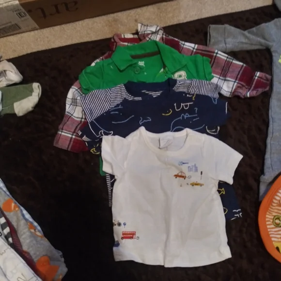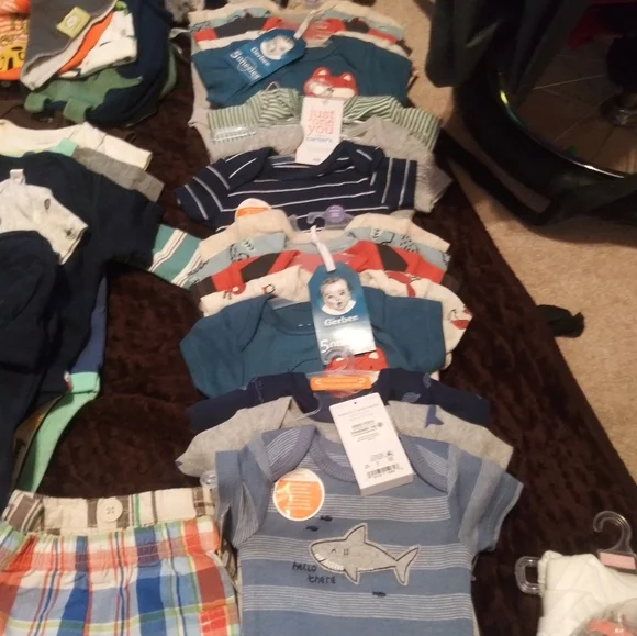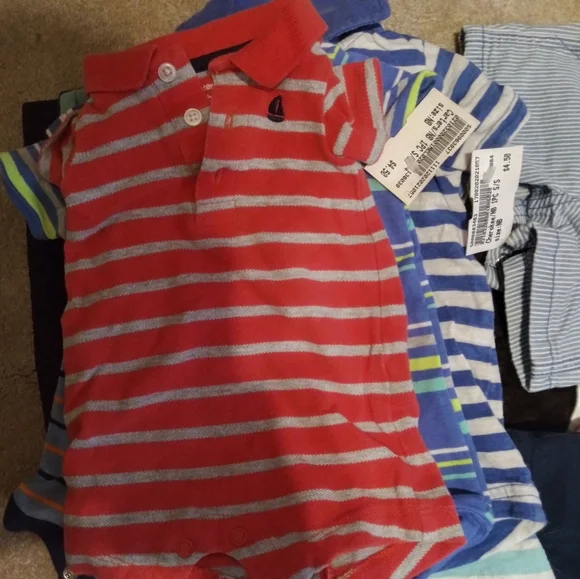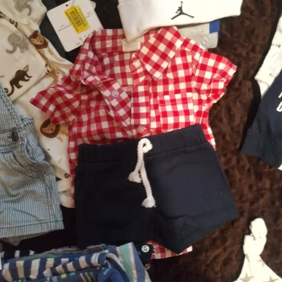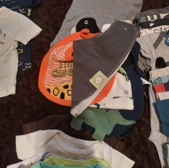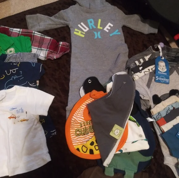 Adorable baby boy clothing set. Includes onesies, shorts, and shirts. Perfect for everyday wear. Multiple brands. Some are NWT and some are NWT from a consignment shop (which means they look new for them to buy.) Also comes with some bibs and those handkerchiefs to keep the drool off your baby's clothes.
