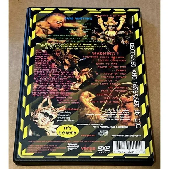 2003 RARE GWAR - Dawn of the Day of the Night of the Penguin DVD from Metal Blade Records. This music & concerts film, rated R, is a must-have for fans of the band. The standard edition DVD release captures the energy and theatrics of GWAR in a live performance setting, making it a unique addition to any collection of music DVDs.