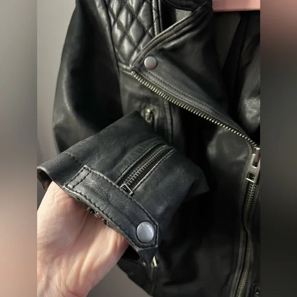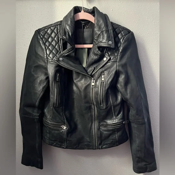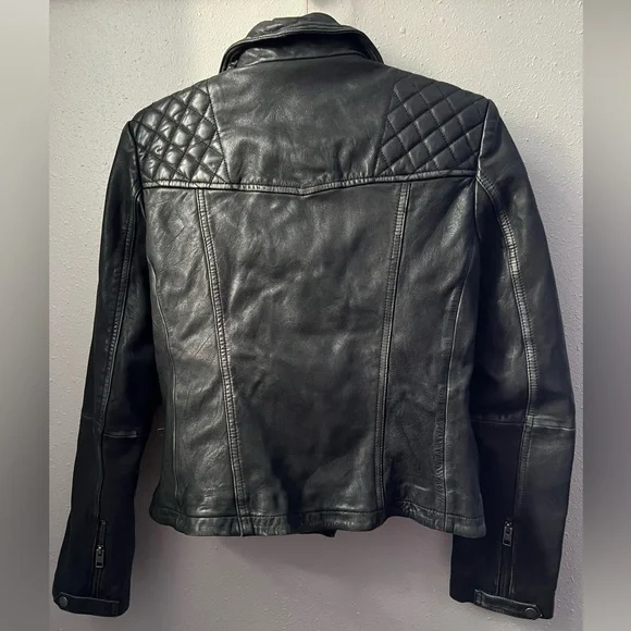 NWTColor: Black/GrayA tribute to the original biker jacket, the Cargo is reminiscent of those found in your favorite vintage stores. Made from robust leather that has been distressed and creased for a distinctly worn-in finish that’s unique to each jacket, the well-loved vibes are strong. With retro-inspired quilted shoulder panels and our signature metal hardware - wear it with anything, anytime, anywhere.This leather jacket is designed to a slim fitBranded gunmetal hardwareQuilting to the shouldersCreased finishTwo lower zip pocketsTab fasteningZip cuffsRecycled liningDue to the distressed nature each jacket will be uniqueSlim fitModel is 5'9.5" / 176cm wearing size US 6100% sheep leatherLining: 100% recycled polyesterSpecialist leather dry clean onlyTags: biker, Harley, classic leather racket, street wear, closet staple, lasts a lifetime, timeless, capsule wardrobe, moto