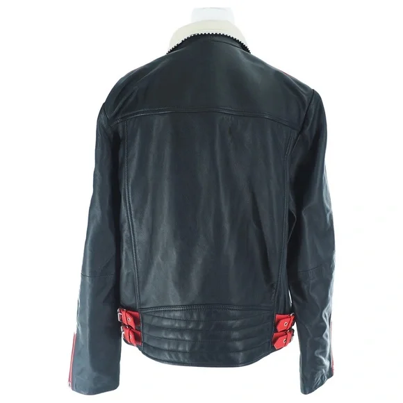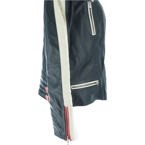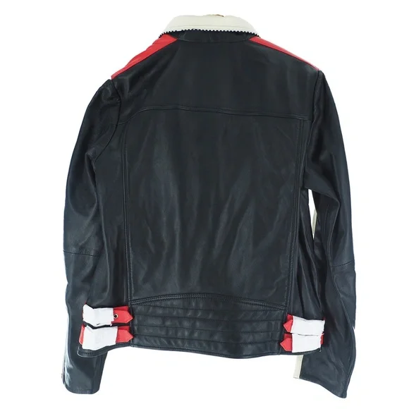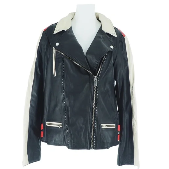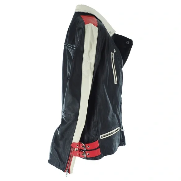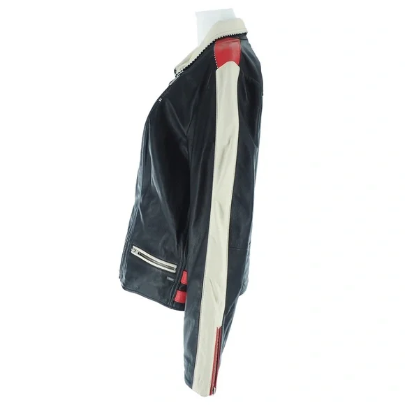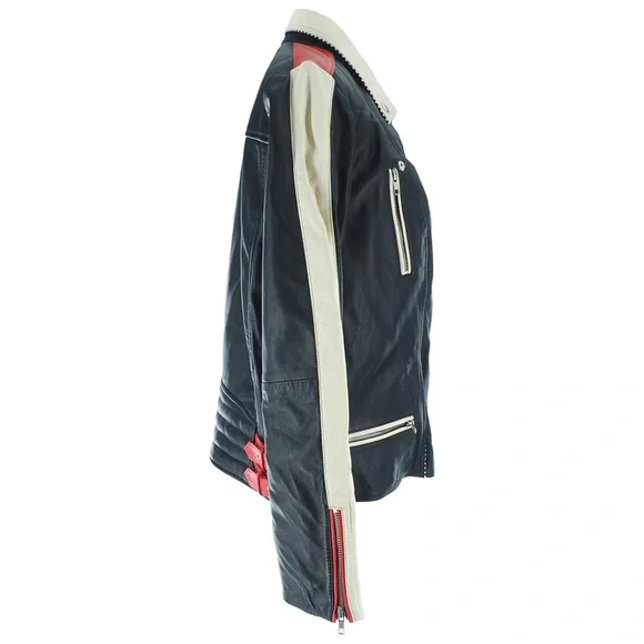 Scotch & Soda Racer Moto Leather JacketWomen's Size:XLColor:Black w/Red + Cream Color-blockingCheckered Black + White Detail100% Leather Exterior FabricationZip ClosureTwo Horizontal Front Zip PocketsOne Vertical Zip Front PocketCollar Snaps DownZip Cuff ClosureDouble Buckle Straps on Each Side of WaistQuilted Lower BackFully LinedAdjustable Belted DetailBNWT / Never Tried On