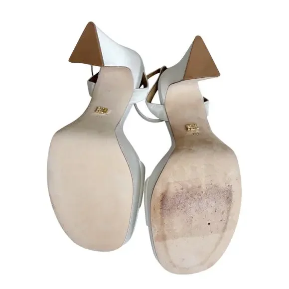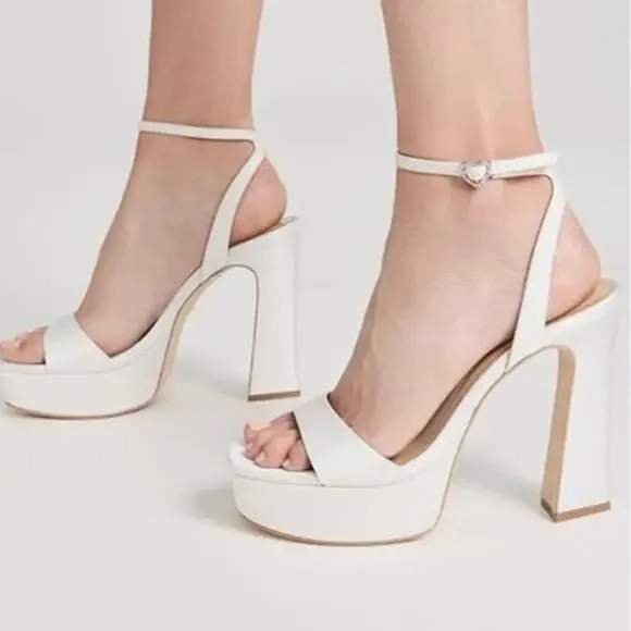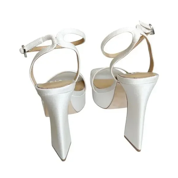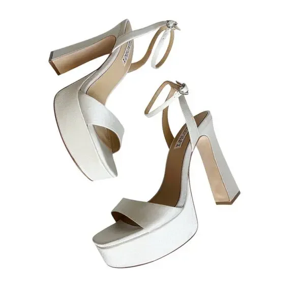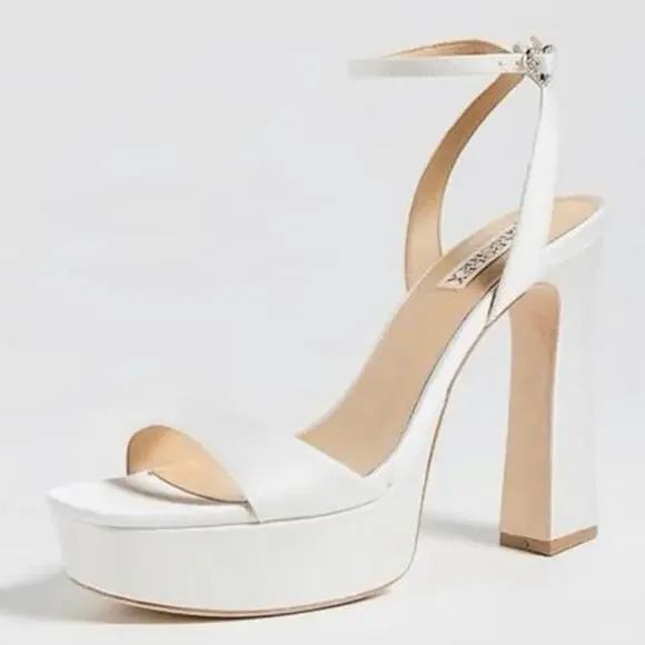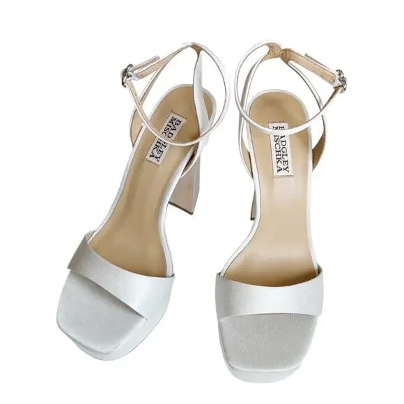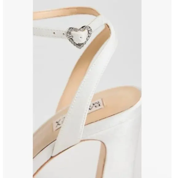 Only the right heel was worn, and just once. Not even worn long enough for any foot imprints. The left shoe is brand new! Retail: $245Badgley Mischka Caia platform sandals are crafted of crepe and leather with crystal trim. These sandals feature an open toe, a 4.75 inch block heel, a 1.50 inch platform, an adjustable ankle strap with embellished heart buckle, and a leather outsole. The lining is leather. Spot clean.