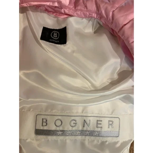 Women's pink puffer jacket by BognerUS Size: 10EU Size: 40Measurements: Chest: 20" measured armpit to armpitLength (neckline to hemline): 29"Length of sleeve (shoulder to end of sleeve): 24.5"* Bubblegum pink puffer coat* Zips up front; Logo zippers* High neck/collar* 2 front pockets zip closure; Inner zip pocket* Lined* Branded insideMaterials: Body - 75% Polyamide, 25% Polyurethane Filling: 80% Down, 20% FeathersCondition: In great condition with no stains, rips or tears!Please let me know if you have any additional questions and feel free to check out my other listings. Thanks!45557