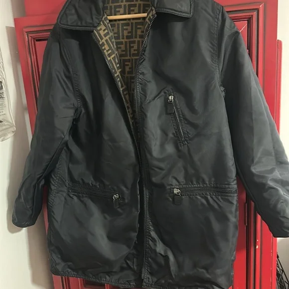 Elevate your style with this Authentic Fendi reversiblejacket in black and brown. Fendi side two vertical pockets & on black side two horizontal pockets on bottom & vertical top pocket & 💦 repellent.Perfect for any occasion, this jacket combines luxury and style.30 inches long..🩷OPEN TO OFFERS🩷MOTIVATED SELLER..😉