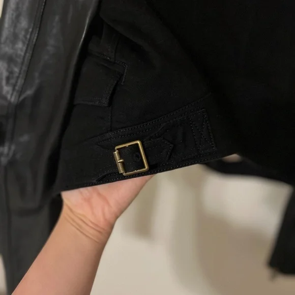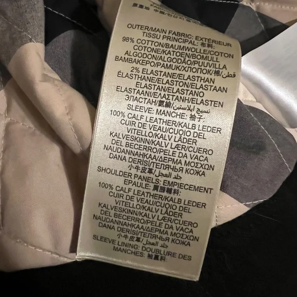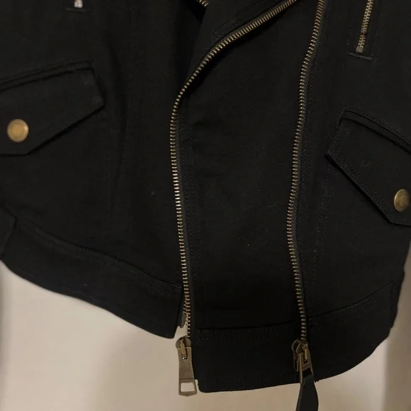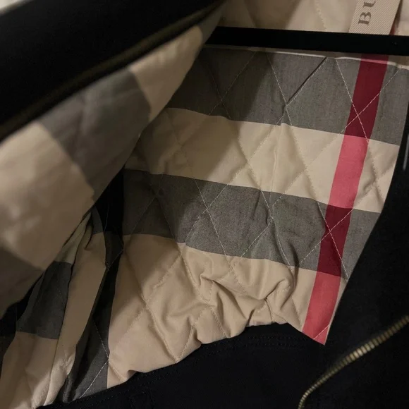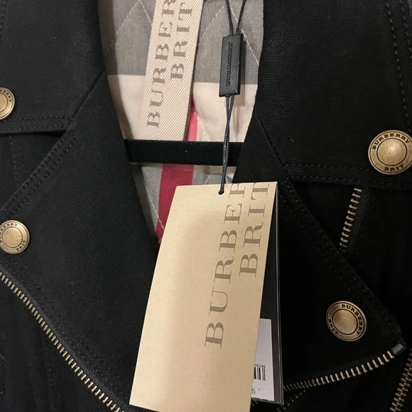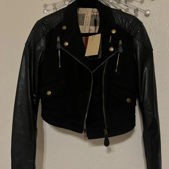 Women’s size M Burberry jacket. Burberry comes in a slim fit this Jacket fits more like a size small. Edgy High Fashion Moto cropped jacket. Perfect for any occasion and any Style a must for any wardrobe.Dress up or down from day to evening. Durable material for years to last. Black. Soft real leather sleeves with a quilted inside of the classic Burberry check design. Antique gold button accents, two Asymmetrical zippers. heavy duty beautiful hardware details on arms and sides of waist.flattering cut .