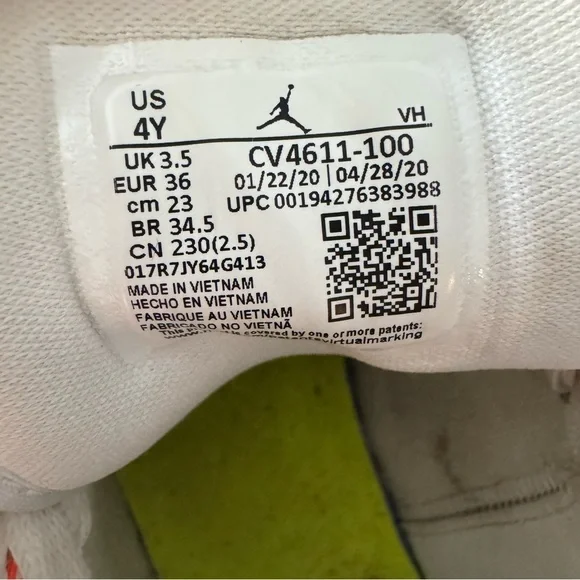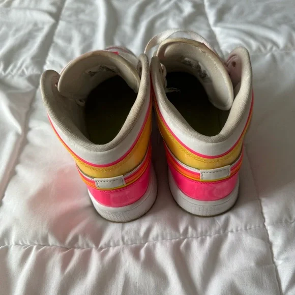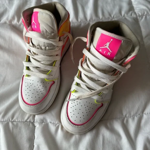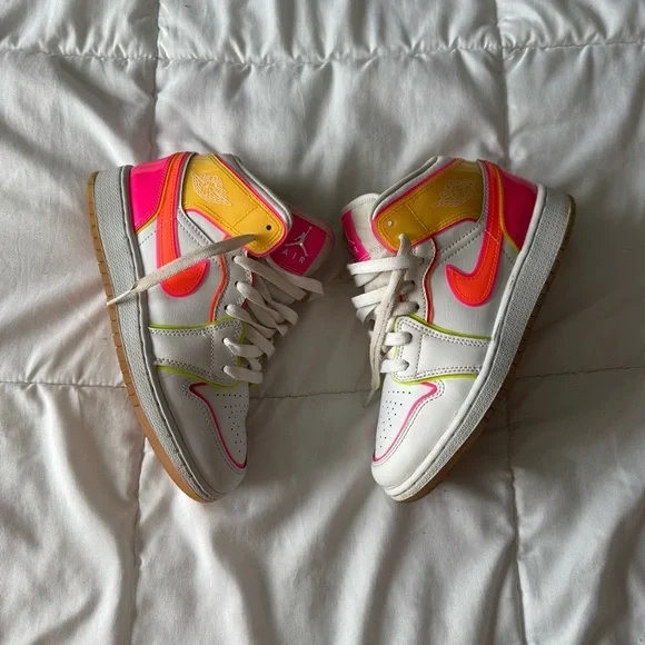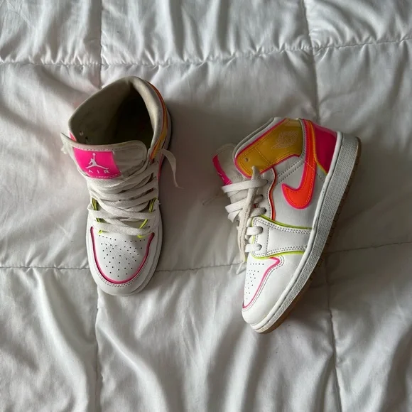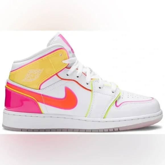 Nike Air Jordan 1 Mid SE GS 'Edge Glow'Size 4YMade for big kids, the Air Jordan 1 Mid SE GS 'Edge Glow' enlivens the classic silhouette with fluorescent pops of color. In addition to highlighter piping, the white leather upper is contrasted by glossy coated overlays in contrasting orange and fuchsia hues at the collar and heel. Pink trim outlines the shiny orange Swoosh, while a matching pink Jumpman tag adorns the nylon tongue.The mid-top rides on a white rubber midsole, reinforced undertoot by a two-tone translucent rubber outsole.SKU: CV4611-100
