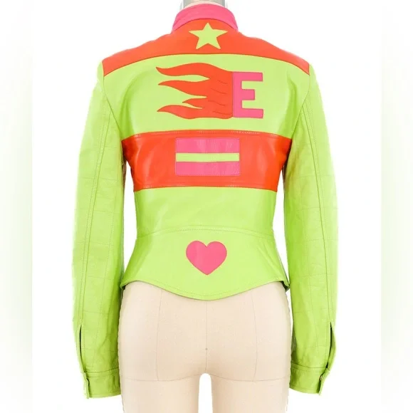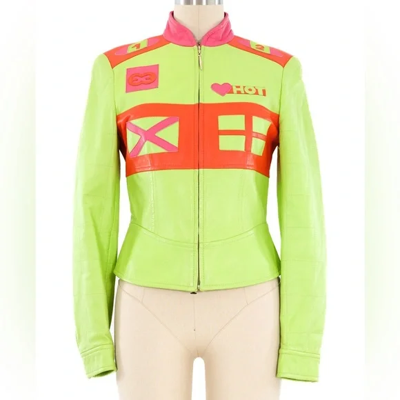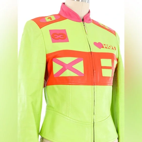 Designer: EscadaCondition: Very good vintage condition, slight wear throughoutSize: 34 (see measurements below)Material: 100% Leather, Lined in SilkClosure: Zip FrontMade in PolandMulticolor moto style leather jacketNeon patch style appliques including flags, hearts, numbers, and a flaming ELined in black and white racing checkered silkBust 34"Waist 28"Shoulder 16"Sleeve 24"Length 21"