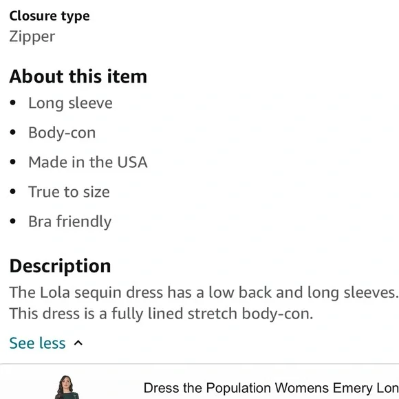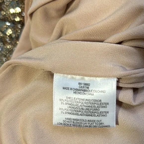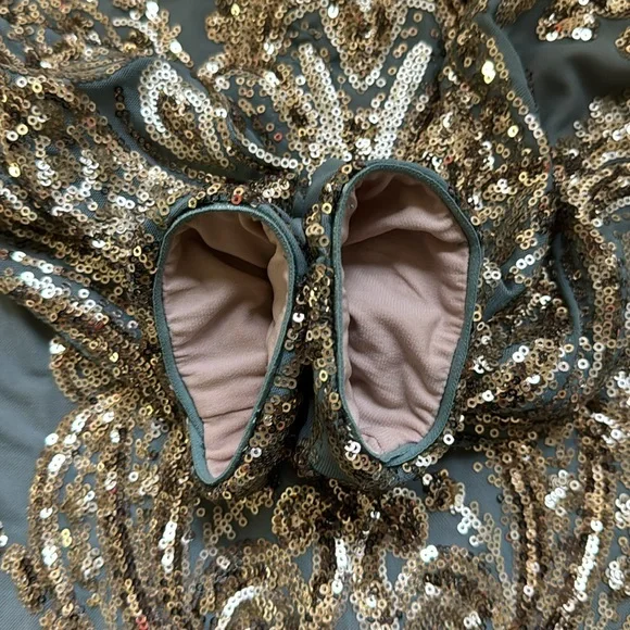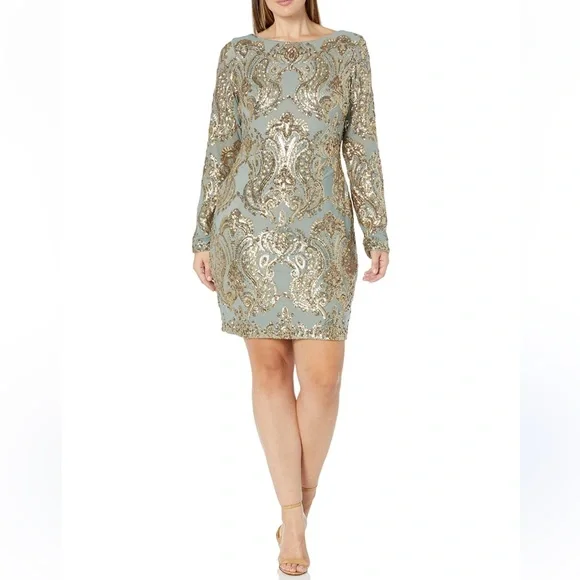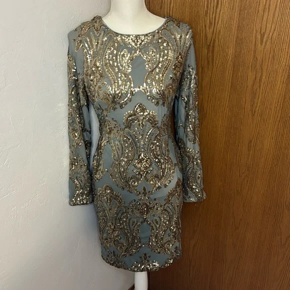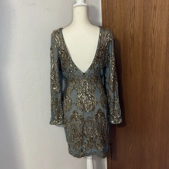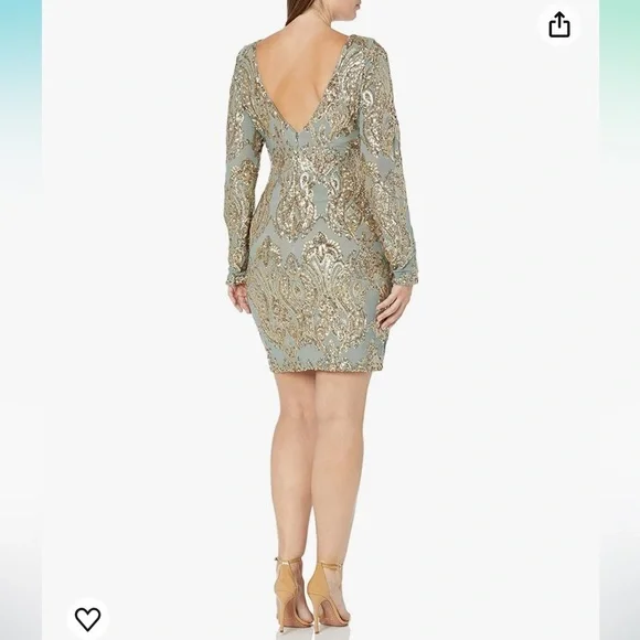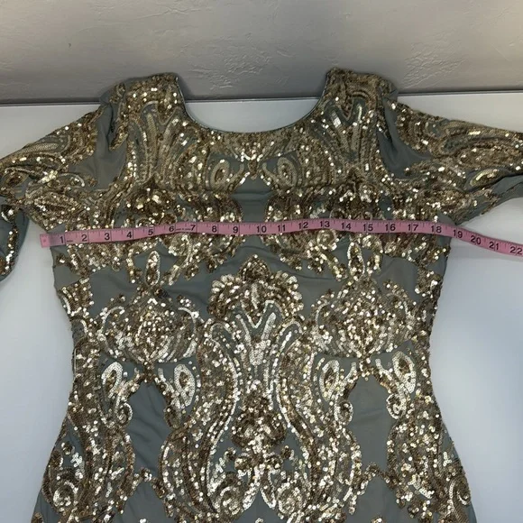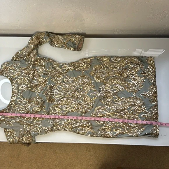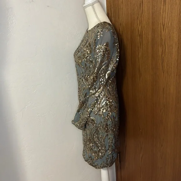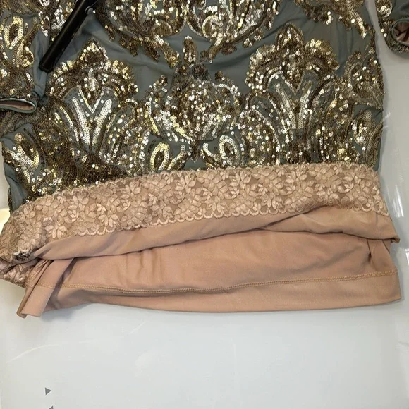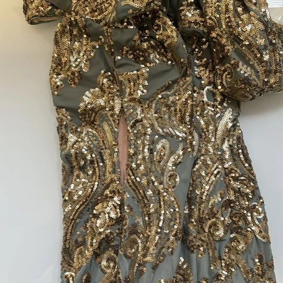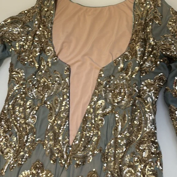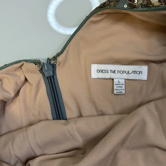 Worn once Dress the Population Lola Long Sleeve Sage colored lined Dress with gold Sequins size Large. This dress is very nicely made and is stretchy. I’ll never wear this dress again and I feel someone needs to enjoy it.I popped the stitches under the arm on the seam, just on the outside not on the liner part(as shown in last pic). So all you would have to do is sew the seam back up and you’ll have yourself a fabulous dress. Details and measurements in pics.