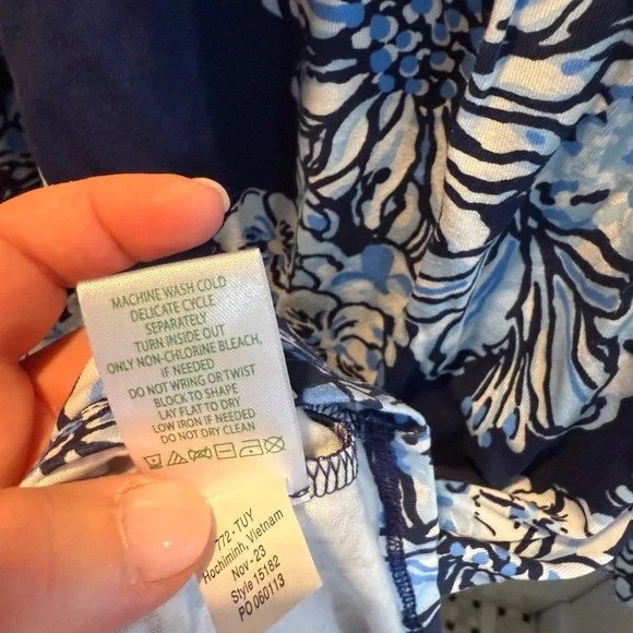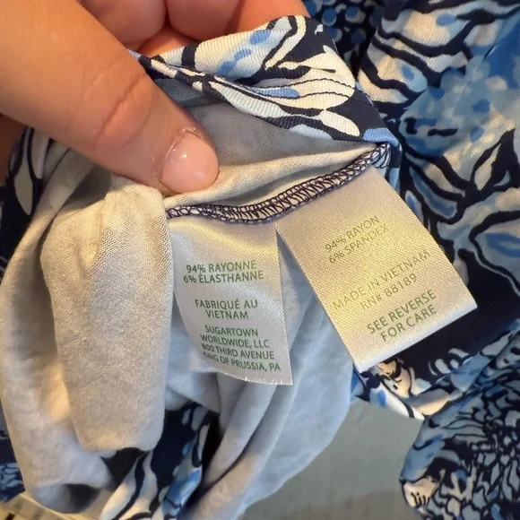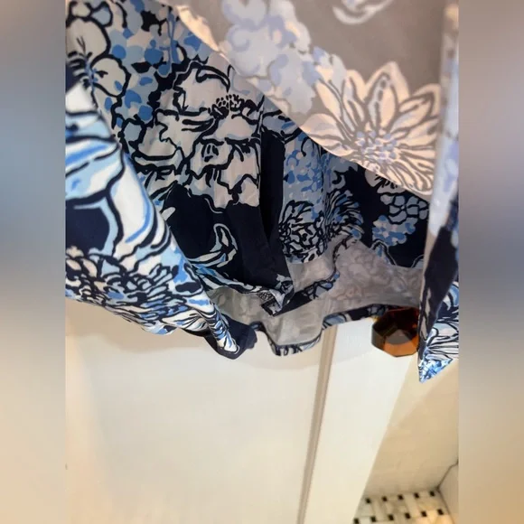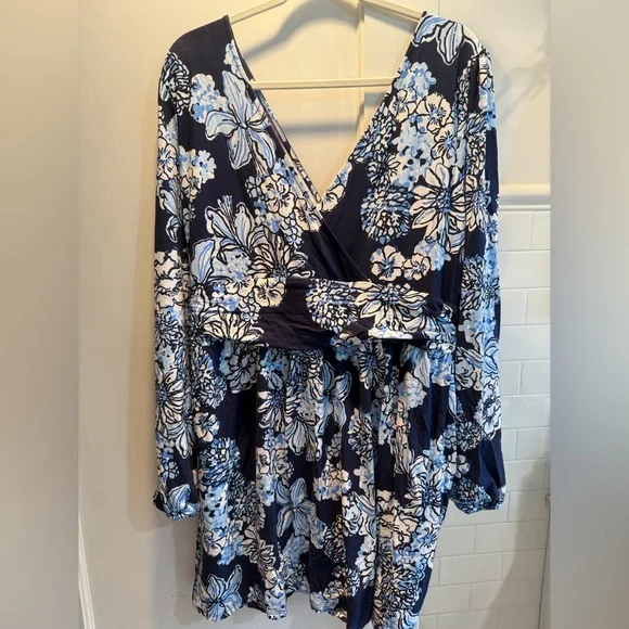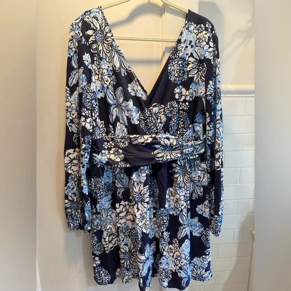 Lilly Pulitzer Romper Dress showcases a beautiful floral print in shades of blue, perfect for resort wear. The dress features a flattering V-neckline and long bishop sleeves, offering a relaxed yet stylish silhouette. Pull on styling with under shorts!