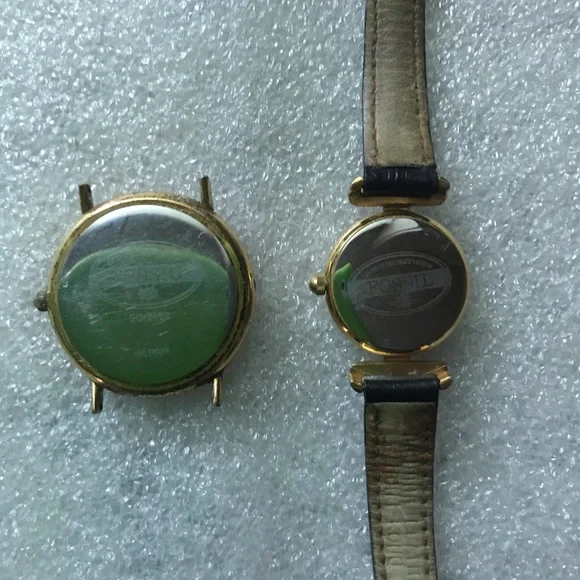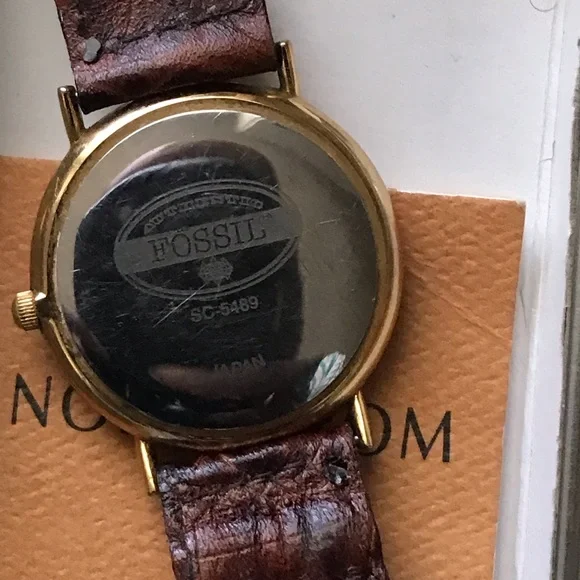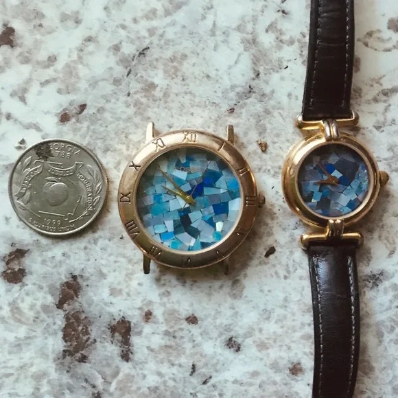 Discover the rare vintage gem, the 1990’s Mosaic Fossil Watch SC-5289, with only one left available for sale. This unique timepiece includes the original braided Fossil leather band and boasts a 9/10 condition, fully operational. Featuring a shattered opal dial within a gold case, this watch exudes timeless elegance. Please note that the smaller version shown is for comparison only and not included. Don’t miss your chance to own this one-of-a-kind piece! #VintageFossilWatch #MosaicWatch #OpalDial #VintageElegance