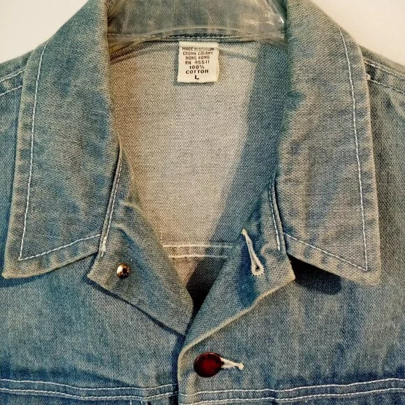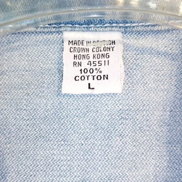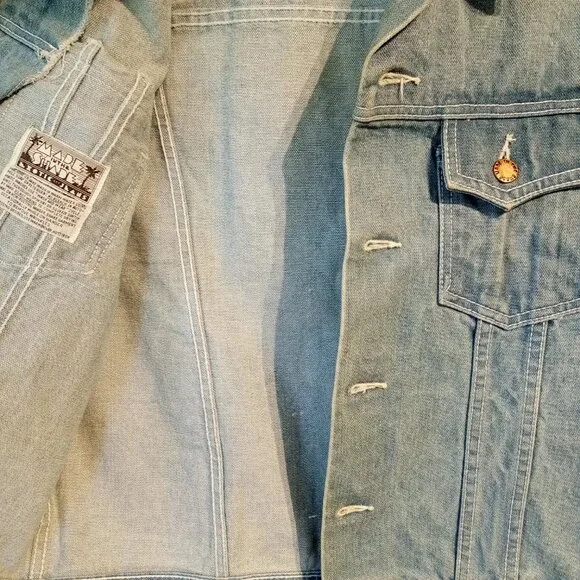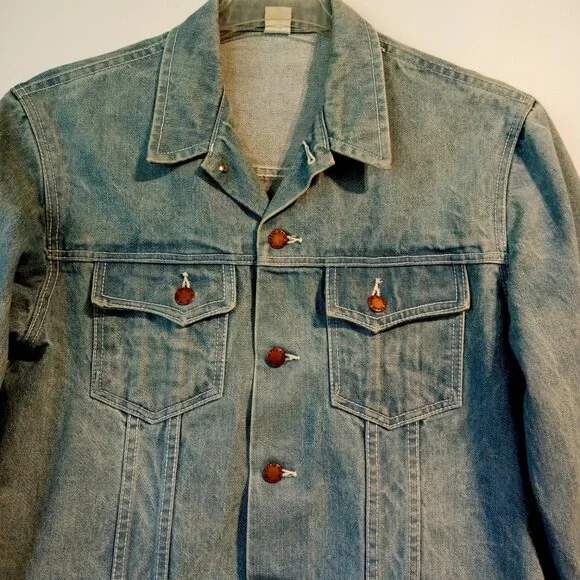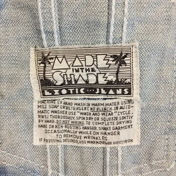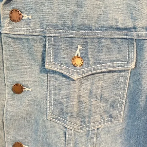 Made In The Shade Denim JacketSizeLargeLight wash100% CottonFull button front2 chest pockets with button closuresButtons on back side of waist.Trucker StyleGreat for Men or Women22" across the chest just below armpits19" across the back27" shoulder seam to wrist25" down the backThis classic denim/jean jacket has beenpreviously worn and shows some veryslight normal wear.No major flawsPlease Note:The cuffs show some slight discoloration.See all pictures for details and condition