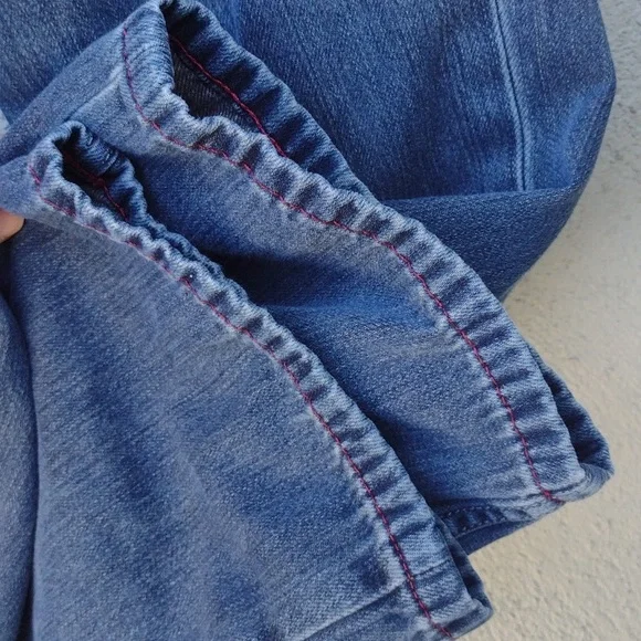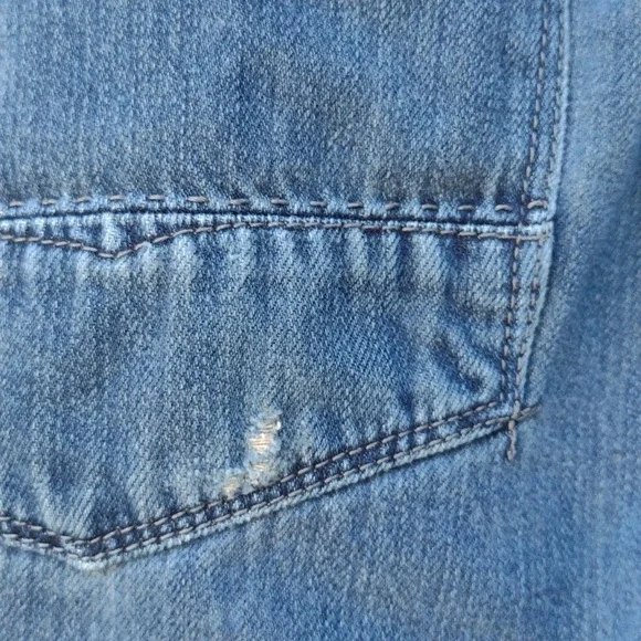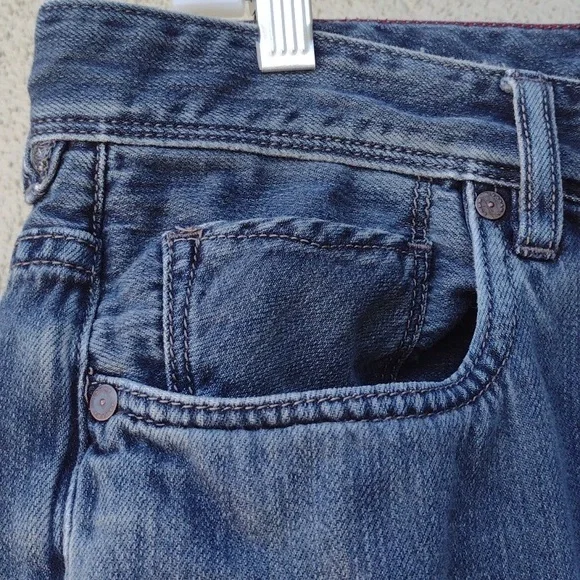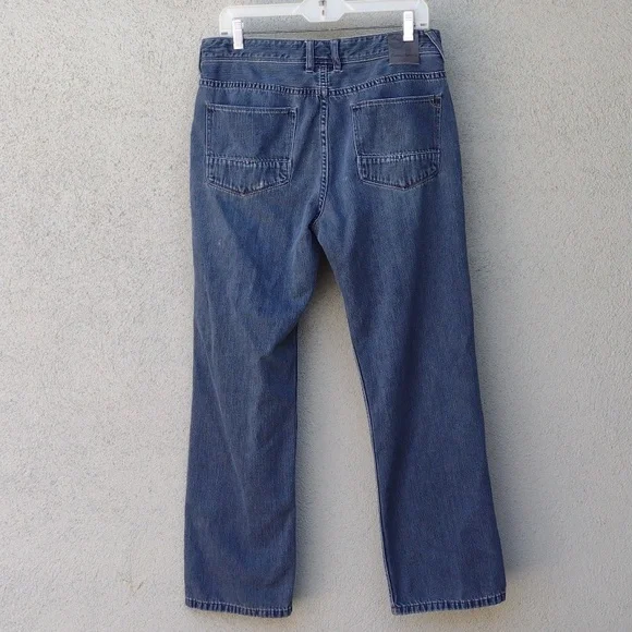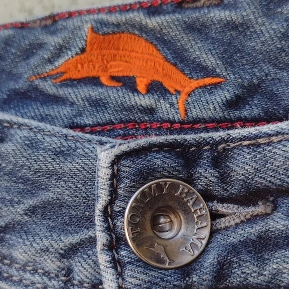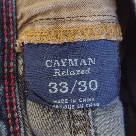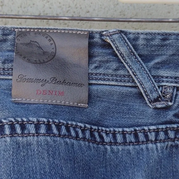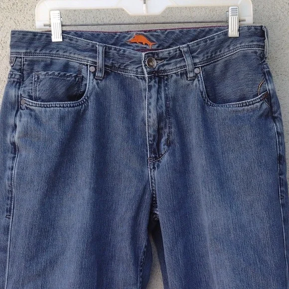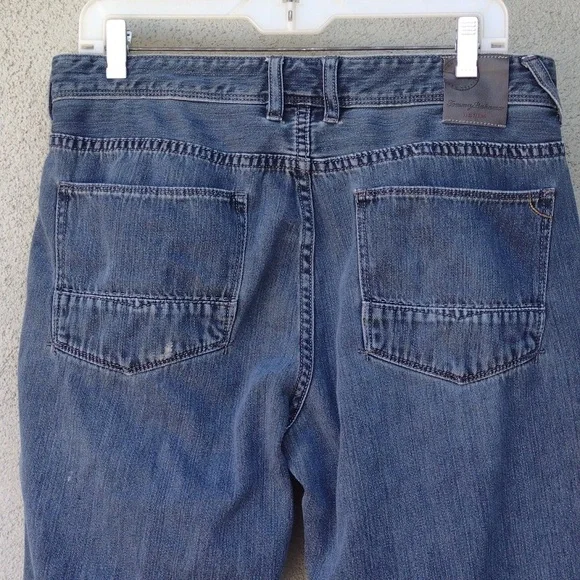 Tommy Bahama Cayman Relaxed jeans. Says 33x30, but measures 33 x 28.5.Zipper and button closure.5 pocketsFlat front.Soft version of a classic casual staple.Made in China.65% cotton35% tencel lyocellApproximate flat measurements (compare to an item that fits you)Waist: 16.5"Rise: 10"Inseam: 28.5"Hips: 22.5"Leg opening: 8.5"Very good pre-owned condition. Minor signs of wear, particularly on back pocket. Three light spots on the back, see photos. Smoke-free.