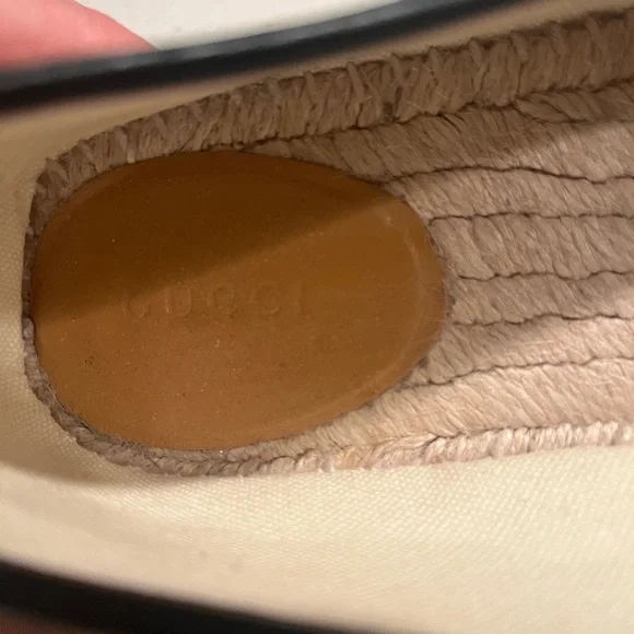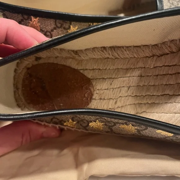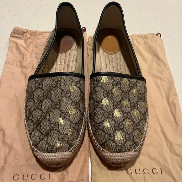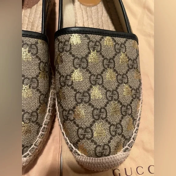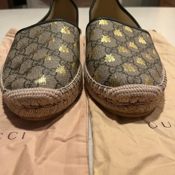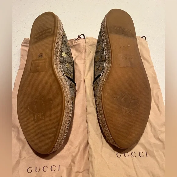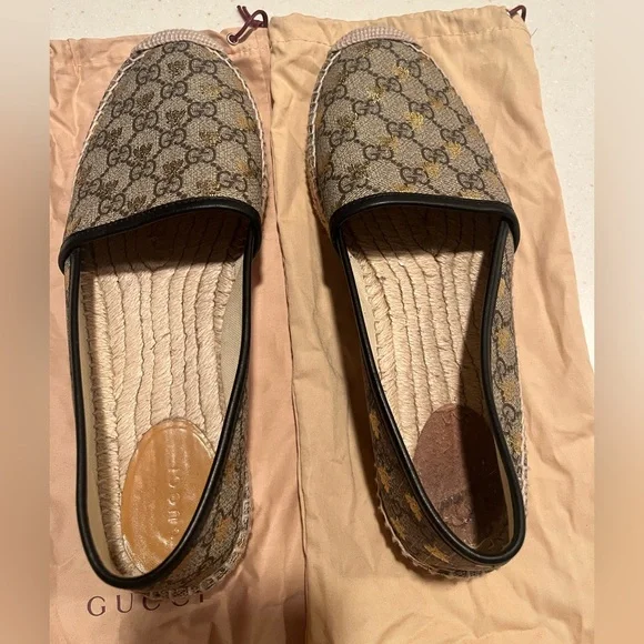 Gucci Supreme Bee Canvas Espadrilles size 42Beige canvas The shoes feature Gucci's iconic GG monogram canvas with a golden bee motif. They have black leather trim and a braided jute sole. Material:These espadrilles are made from canvas with leather accents and a rubber sole. Inner sole on one shoe is worn down (pictured) otherwise shoes are in great shape!Check Gucci shoe sizes for accurate size measurements