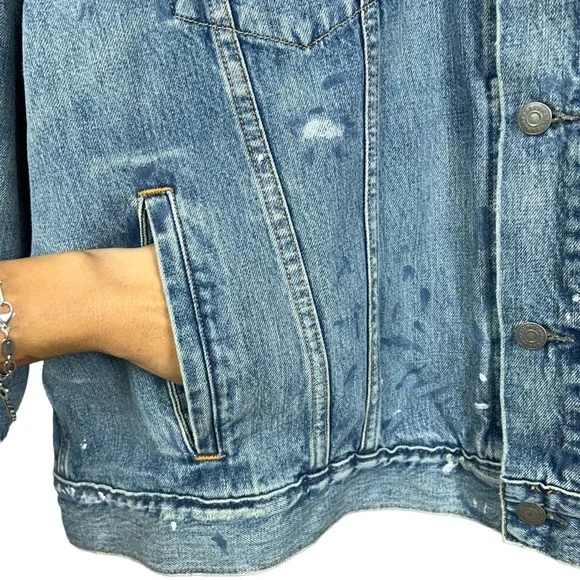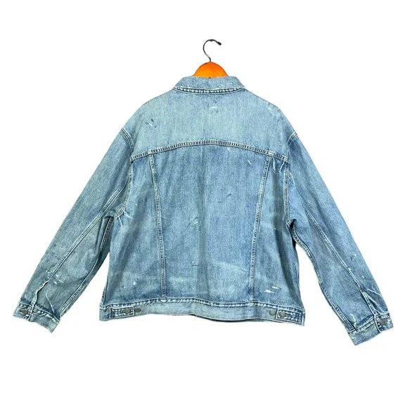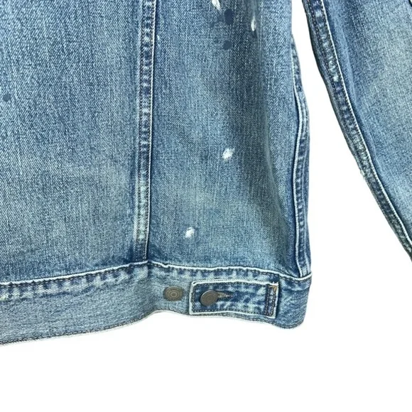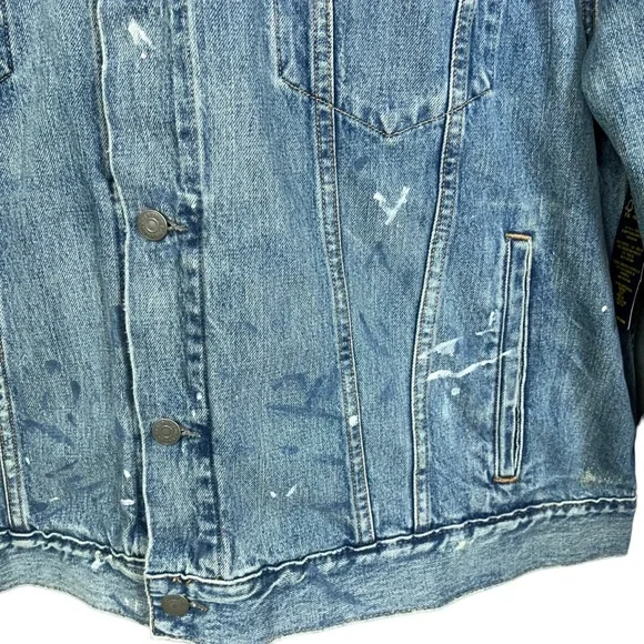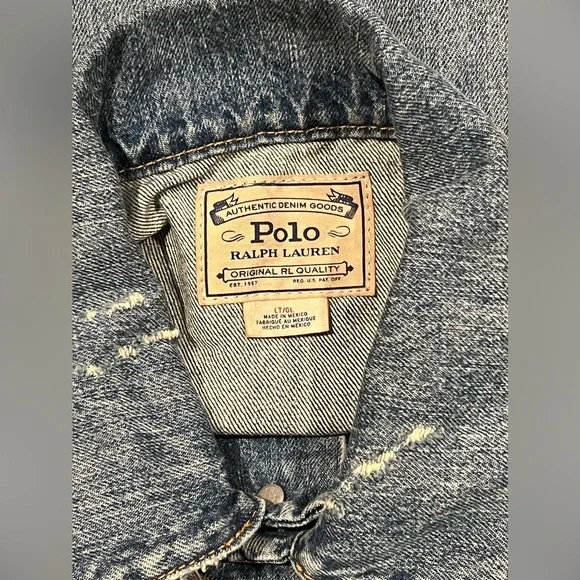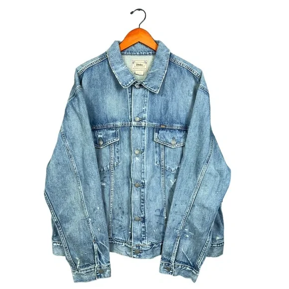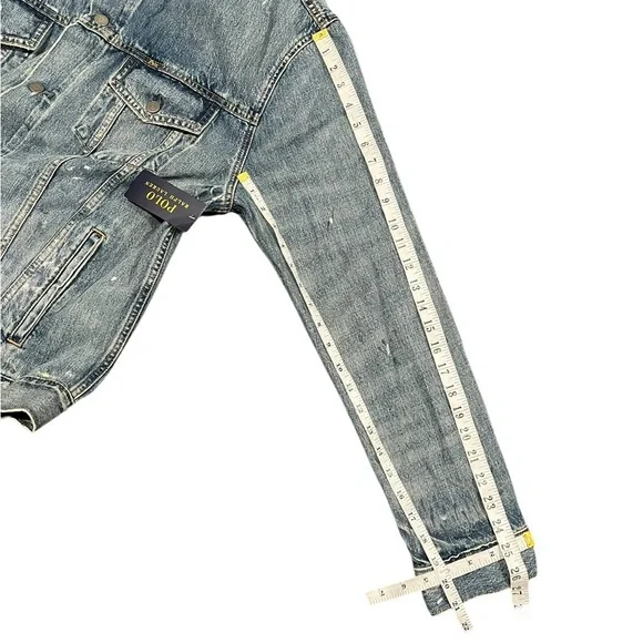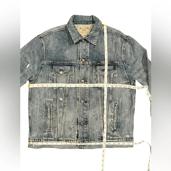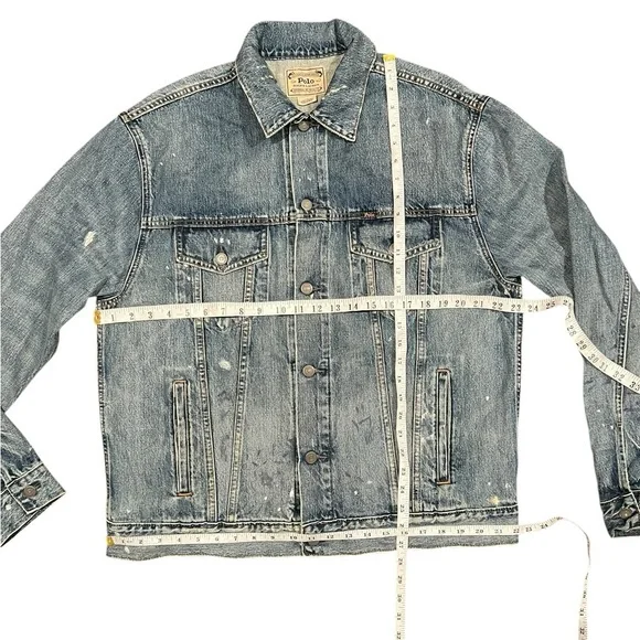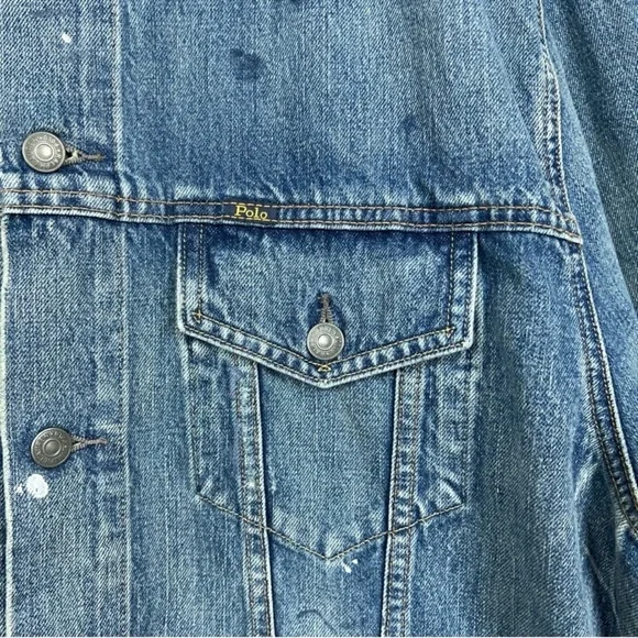 Polo Ralph Lauren Denim Jacket Mens Trucker Blue Distressed Paint Splatter LTPolo Ralph Lauren Denim Jacket in a beautiful blue color. This trucker jacket is made of high-quality cotton material that is perfect for fall, spring, and winter seasons. The jacket features a spread collar, button closure.Please note, all measurements are- APPROXIMATE.- Please compare measurements to your favorite garments at home to ensure fit.- Please note, lighting may affect color in pictures.