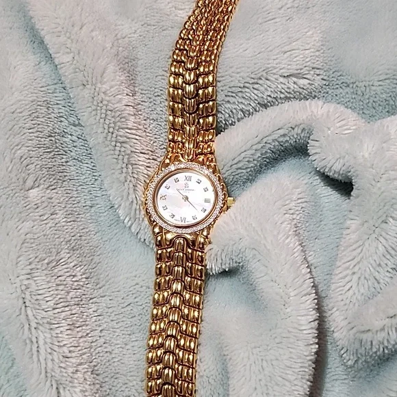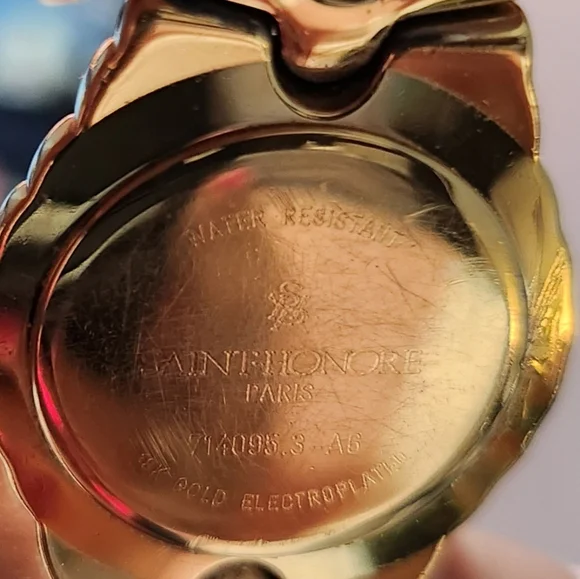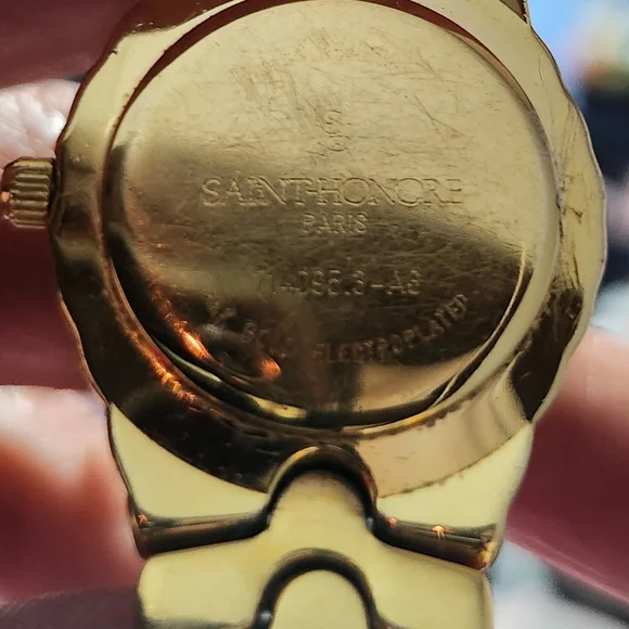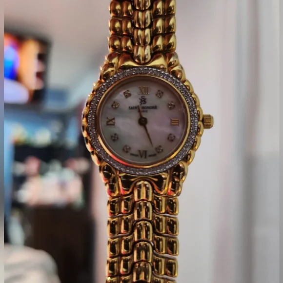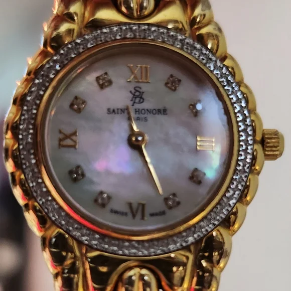 EUC Saint Honore Paris with mother of pearl face18kt gold plated band Women's Watch 6" bracelet can be lengthened with clasp extender easily availablemeasurements approximatePerfect working condition with new battery. Timeless beautyEvery effort is made to describe fairly along with pics. please ask any questions prior to purchase.