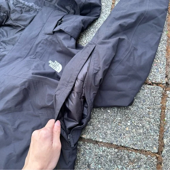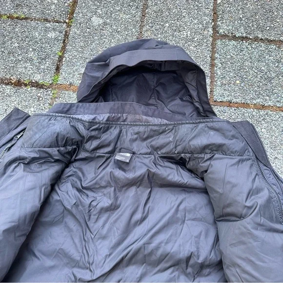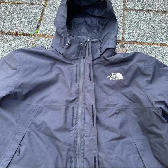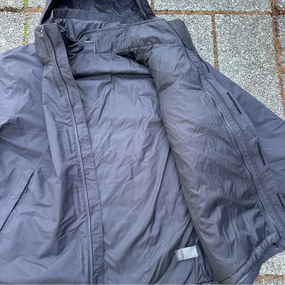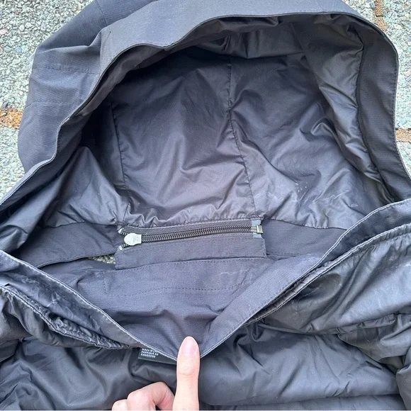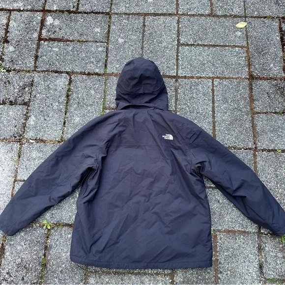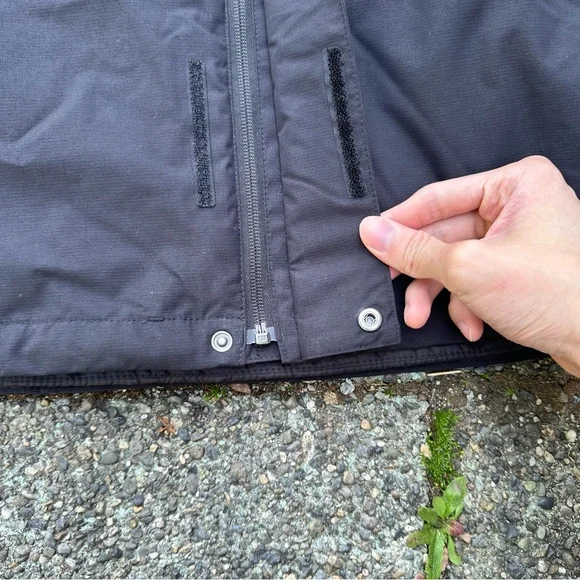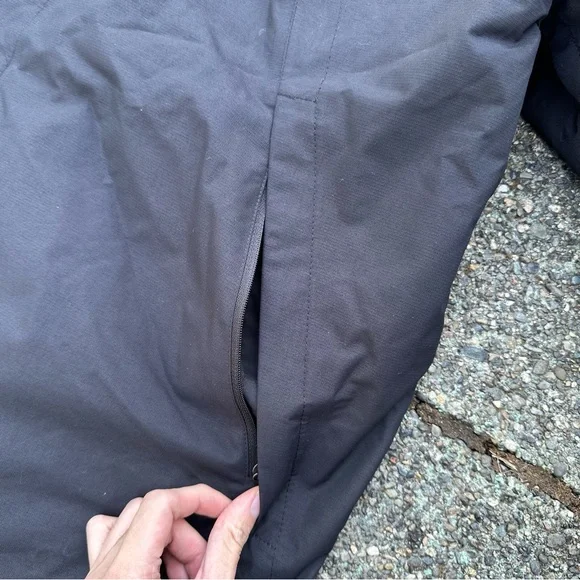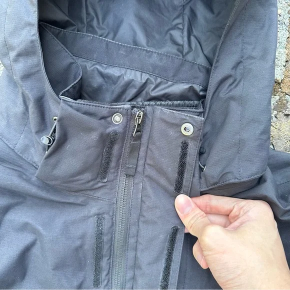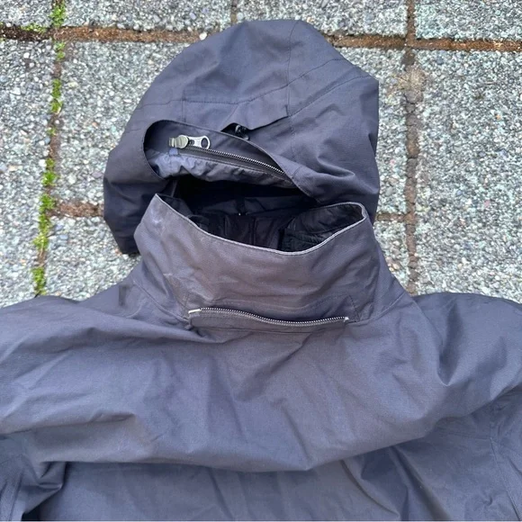 • Size: Men’s XL• Color: Black• In good condition, no rips or stains• Zip-up front with velcro and snap closures• Adjustable hood with zip stowaway compartment• Two zip hand pockets + pit zips for ventilation• Lightly insulated inner lining – good for light cold and rain• Great for hiking, travel, or everyday use