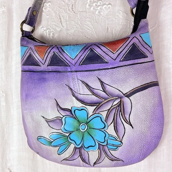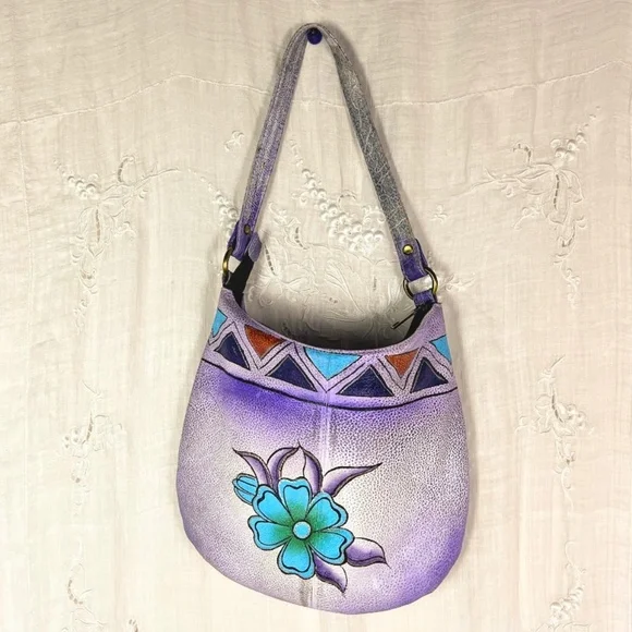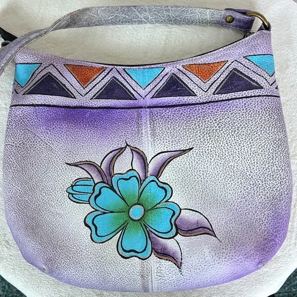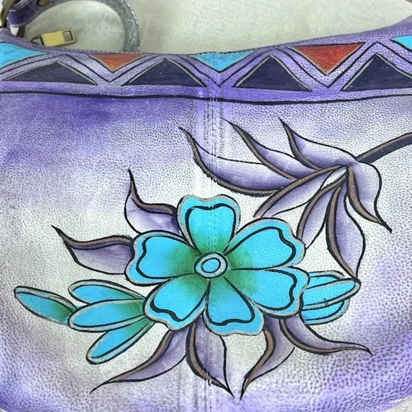 Pebbled Leather Wearable ArtHand painted floral designPurple, sky blue, gold/copper, black, amber, silver colors12" wide X 10" tall3/4" wide handle with 10" dropZipper closureCompletely linedInside zippered pocket and (2) slip in pocketsMade in IndiaPurchased NWT / Removed tags & literally used 1XPerfect condition! Absolutely no flaws inside or outsideLove it! Just don't use it.Retail $199Please comment if you have any questions.Reasonable offers usually accepted (or at least countered).Thanks for visiting my closet!Boho Purple Lavender Pebbled Leather Soft Round Floral Teal Blue Green Gold Rust Apricot Amber Silver Hand Painted Like New Triangle Gradient🎉HP Best in Bags 7/9💕TYSM @faithoverfear07🎊HP Stay Cool Posh Party 9/11💐TYSM @heyitskimmie13🥳HP Best in Bags 2/2💟TYSM@kreativekristen🎉HP Bold & Bright 6/29💕TYSM @brightburst