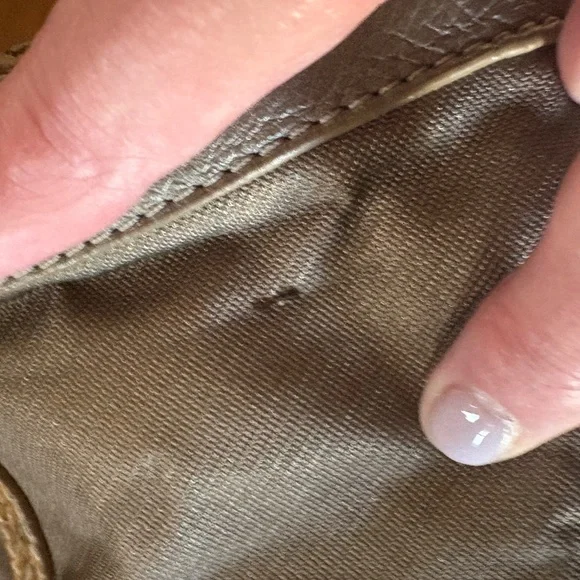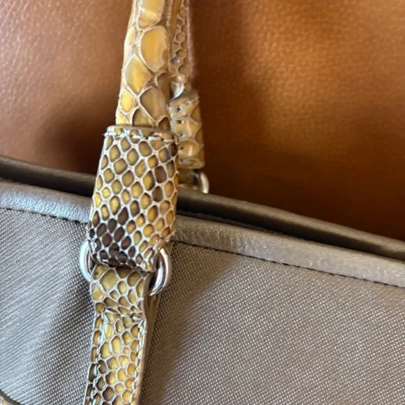 Like New "Pretty Tough" Reed tote bag in a metallic pewter color with snake-print leather accents. This bag features a soft, pebbled leather body, braided leather handles, and a signature Brighton charm. It has a cell phone pocket inside and a center zip pocket with another zip pocket. The exterior includes two side slip pockets. The bag's dimensions are approximately 16 inches in width. Brighton "Pretty Tough Reed" tote bag in a silver or zinc pearl color. This bag is part of Brighton's "Pretty Tough" collection and features:Material: Soft leather with snake-print accents on the handles, sides, and trim.Design: A spacious tote shape with two exterior pockets and a decorative silver charm hanging from one of the handles. The bag's shape can be altered using interior snap tabs. This is actually new but it has one little damaged area on one of the short side of the bag. See last photo.Color: A metallic silver or zinc pearl, which is a signature color in the "Pretty Tough" collection. Features: It has a cell phone pocket inside. Dimensions : 16" wide at zipper - 10’' tall-4" deep Retail Price: Originally sold for $450