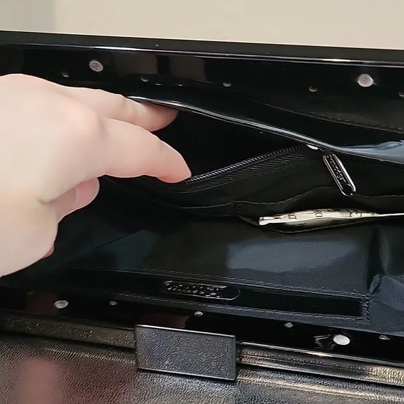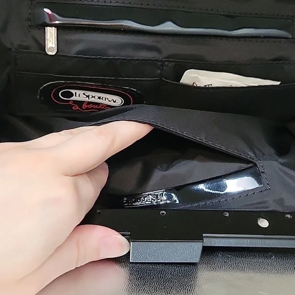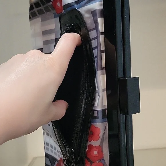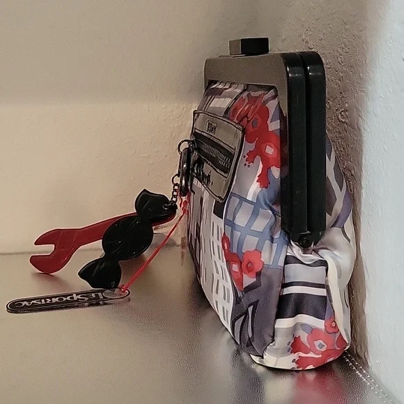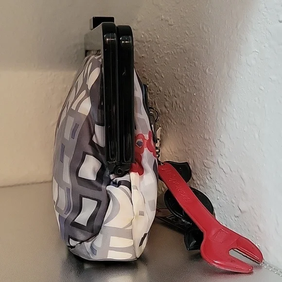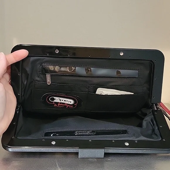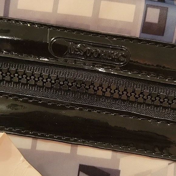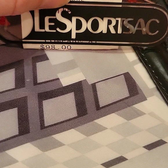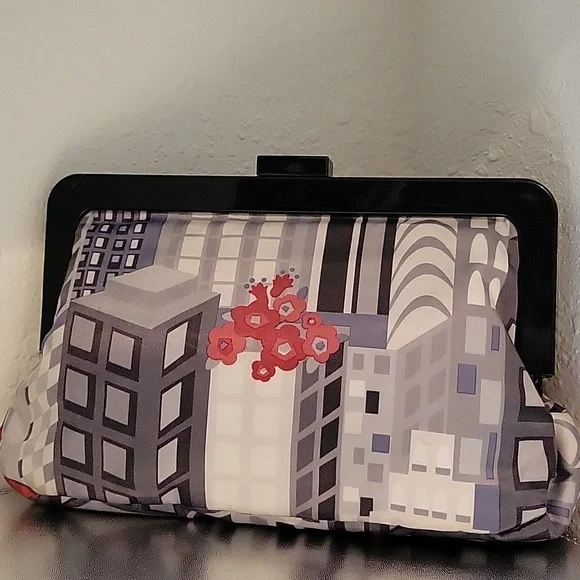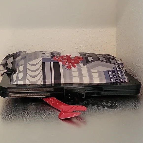 THIS ITEM IS CURRENTLY IN ANOTHER SHOPPER'S CART. BUY NOW WHILE YOU STILL CAN!* New LeSportsac Bouqiue Black, Grey, White and Red Geometric Skyscraper Floral Clutch* Resilent vinyl-like material with patent leather accents* Plastic magnetic closure and patent accents with some minor scratches* Includes tags and branded keychains - candy and wrench* Interior has 1 pouch, 1 zipper pouch, and 4 card slots* Bonus exterior zipper pocket* Measures approx. 7" × 10" × 2"* From a COVID-Free, Smoke-Free home