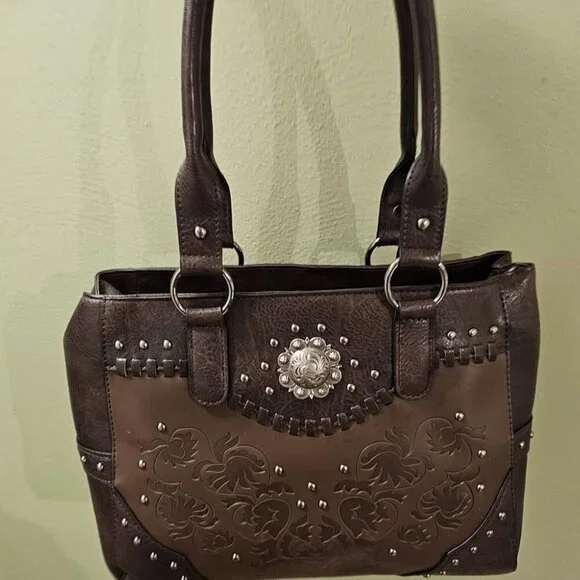 💝💝【Exterior Details】: This western purse accented with embossed flower pattern and silver studs concho, metal feet at the bottom for protection and stability, and with two comfortable handles. keeps all you items neat and tidy with center zipper pocket/divider. Designed with customers in mind. 2 large card slots inside can store personal items.Back open pocket makes it easy to find keys when you need them.💝💝【Perfect size】western purses size 12" (L) X 4.5"(W) X9.3" (H).This tote bag has been designed for women on-the-go by providing security and comfort.💝💝【Large capacity】:This handbag and purse perfect size to fit ipad ,i phone ,keys,credit cards, ID,passport,make up,lipsticks,mirror, Mask ,smartphones, tickets,cash/coins tissues ,umbrellaetc,power bank,wallets etc.💝💝【Perfect Gift 】: This handbag purse is a perfect gift to your wife, mom, girlfriend when Birthdays, Christmas, Thanksgiving Day,Valentine's Day, anniversaries.