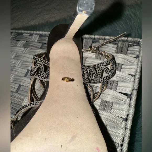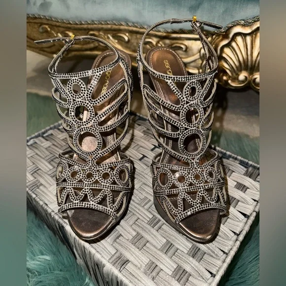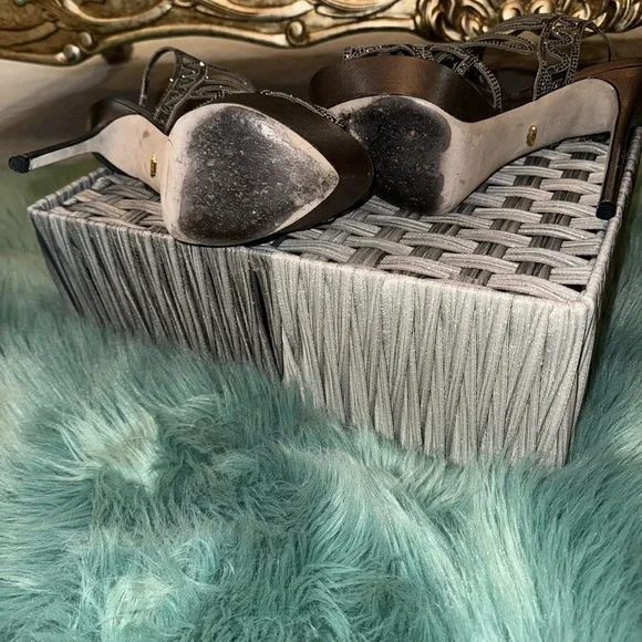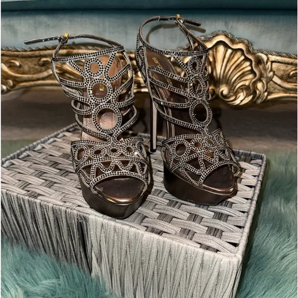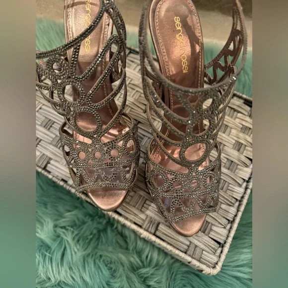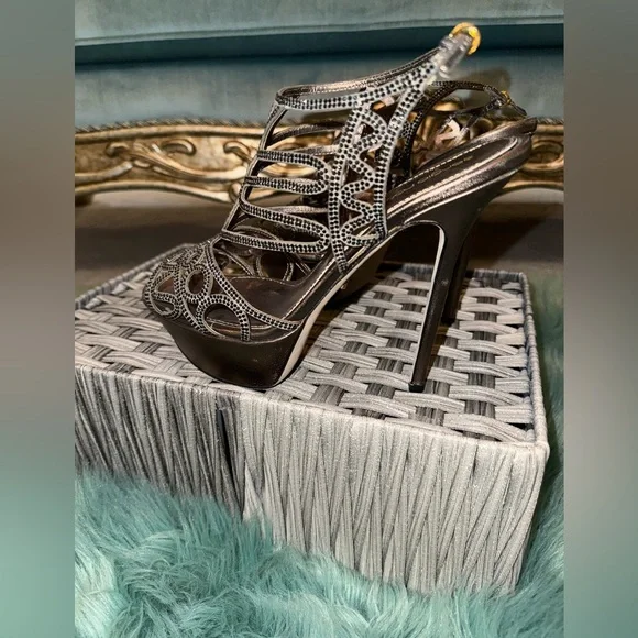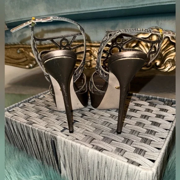 These are beautiful all Swarovski crystal strappy heels by Sergio Rossi. They are all a pewter color leather with the crystals all along the front. They have a small buckle on the sides that open to put on. They have a 5 1/2 inch heel with a 1 1/4 inch platform that makes them comfortable and wearable. Worn once.