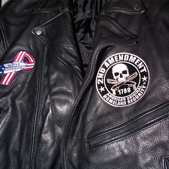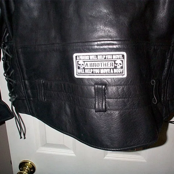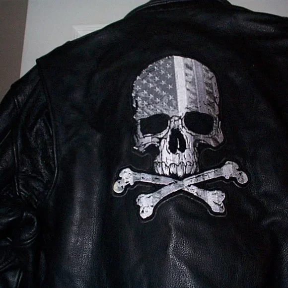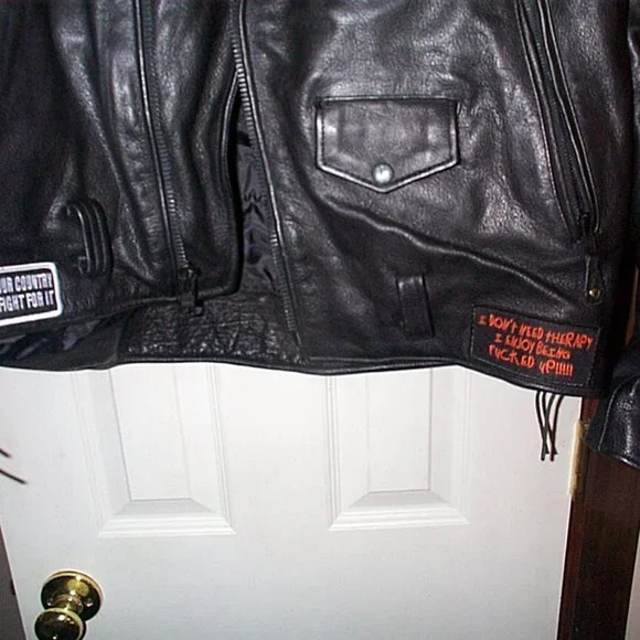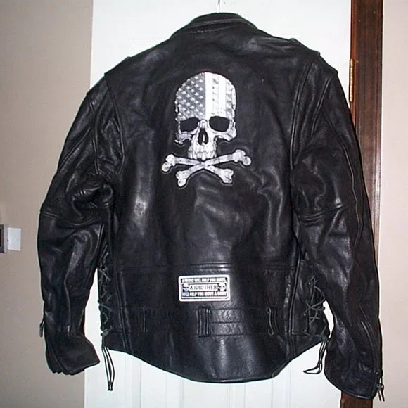 Nice jacket, real heavy. Jacket is used but condition is real good. Has a zipper for a removable liner but I do not have the liner. Tag inside reads Genuine Leather but no tag that says who made it.Lots of pockets. Zipper front. Large Punisher skull patch. Has the lumbar support in the back down by waist. Belt loops but no belt. Size men's 48. Measures 25"s across the chest armpit to armpit. 28"s from top of collar to bottom of jacket. Sleeves are 24"s. Really nice well made heavy jacket, not like the newer leather jackets.