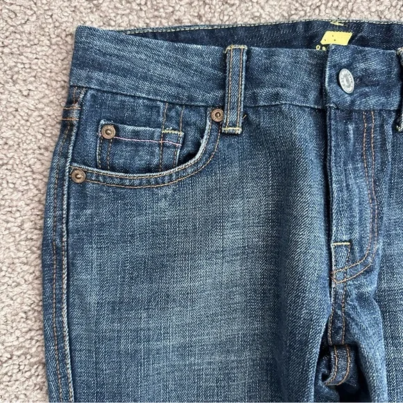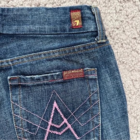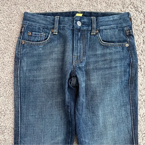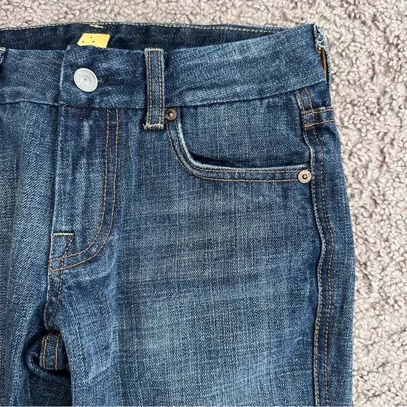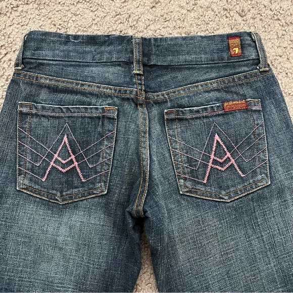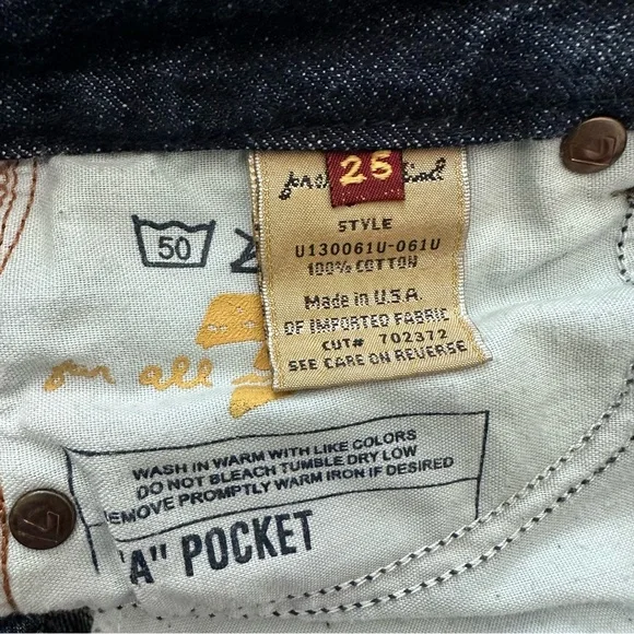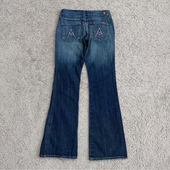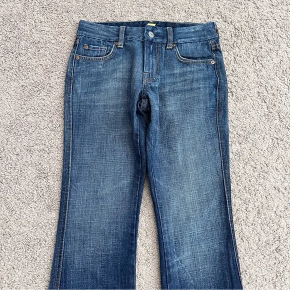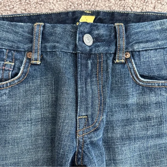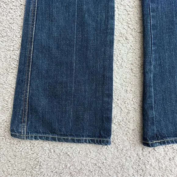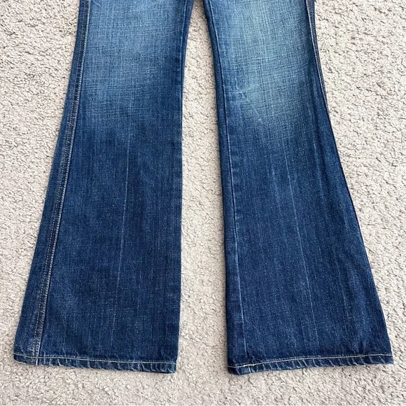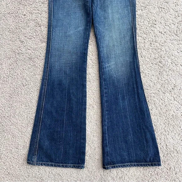 Preowned, great conditionSize: 26 WomensZip fly button closureLow riseFlare leg"A" Pocket embroideredWaist 13.5"Rise 7.5"Inseam 31.5"Measurements are approximate and may differ from tag sizeColor may vary slightly due to differences in lighting, color perception, and even personal opinionFast shippingSmoke and pet free environment