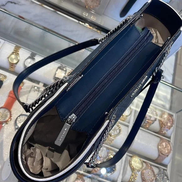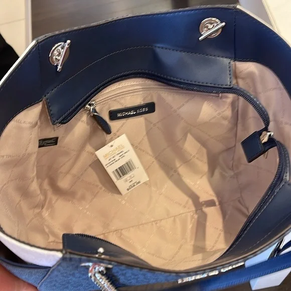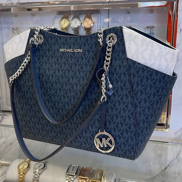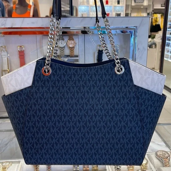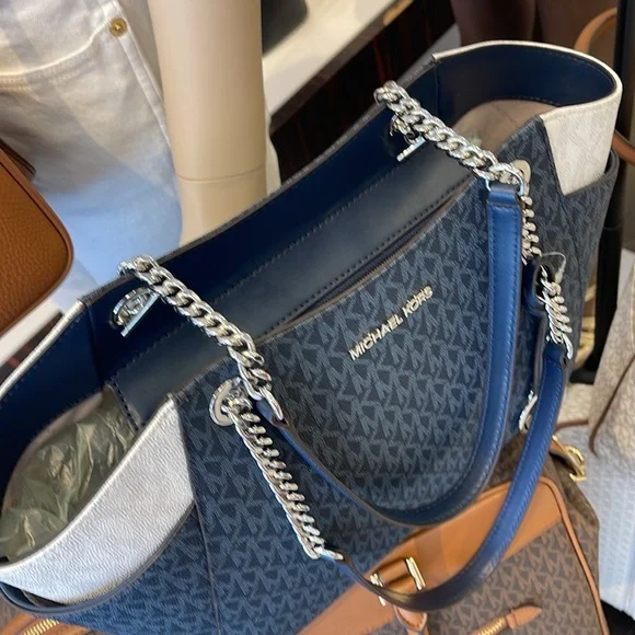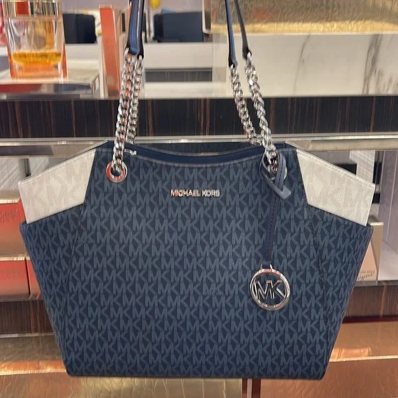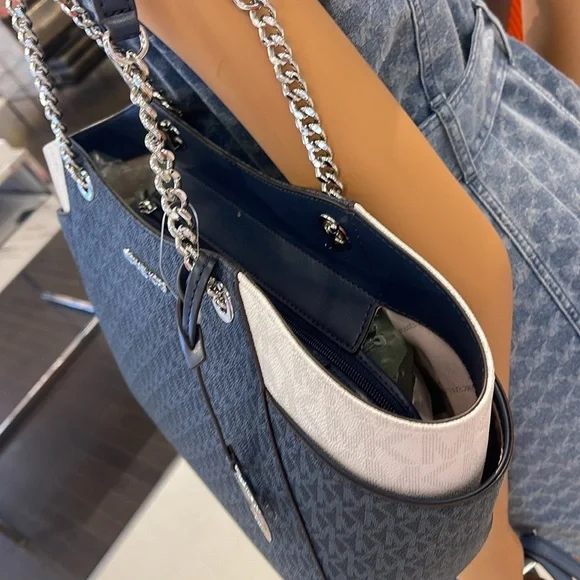 MICHAEL KORS Jet Set Travel Large Signature Chain Shoulder Tote BagNavy Multi NWT Authentic Ready to take you anywhere, this Jet Set shoulder bag is rendered in signature and finished with our signature charm. The architectural shape features convenient side pockets and a secure top-zip fastening. Use it to carry all your travel essentials.• Shoulder bag• 100% leather from tanneries meeting the highest standards of environmental performance• Gold-tone hardware• 15.5"W X 9.75"H X 5.5"D• Handle drop: 10"• Exterior details: 2 side snap pockets• Interior details: back zip pocket, 2 front slip pockets• Lining: 100% polyester• Zip fastening• Dust bag not included• ImportedMICHAEL KORSJET SET TRAVEL35T4STVE3BNAVY MULTILG CHAIN SHLOR TOTE