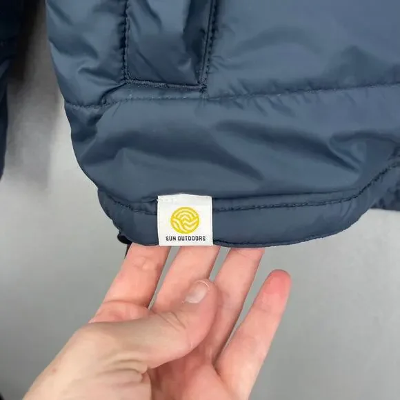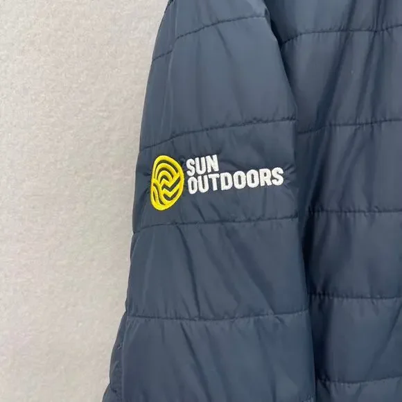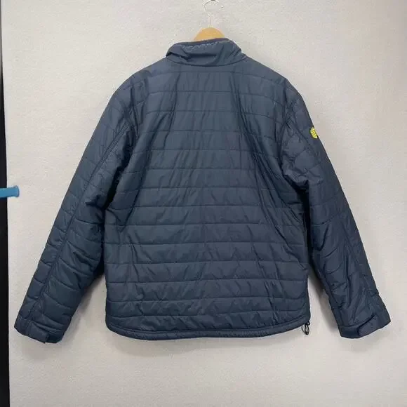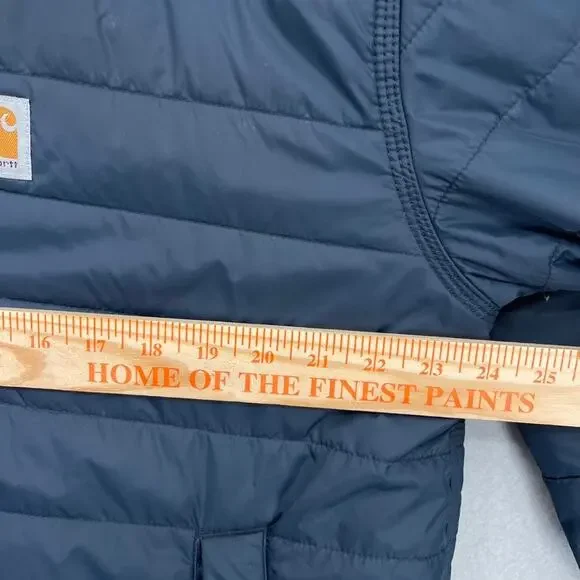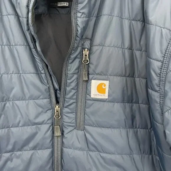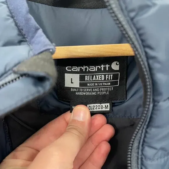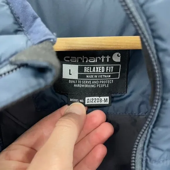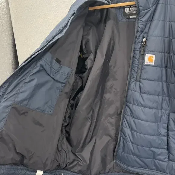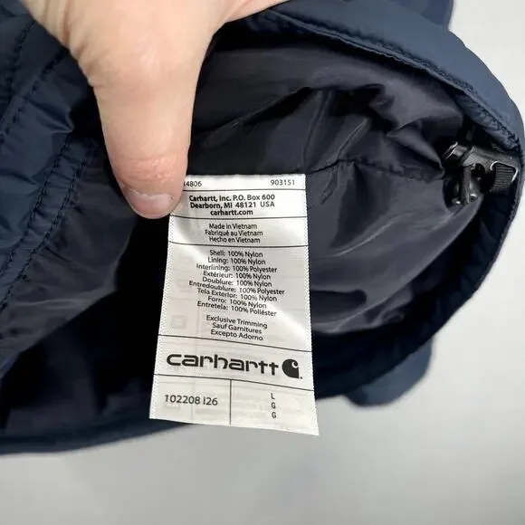 Carhartt Jacket Mens Lg Blue Gilliam Rain Defender Insulated Puffer Work WarmPre-owned condition from a smoke and pet free home. See pictures for details and measurements. **embroidered "sun outdoors" on right sleeve.Size LargeColor: Navy blueFull ZipSnap button lower PocketsDrawcord, adjustable waistWater repellentLeft chest map pocketInsulated Fabric resistant to tears, scuffs, abrasionsMaterial: Shell: Nylon; Insulation: Polyester
