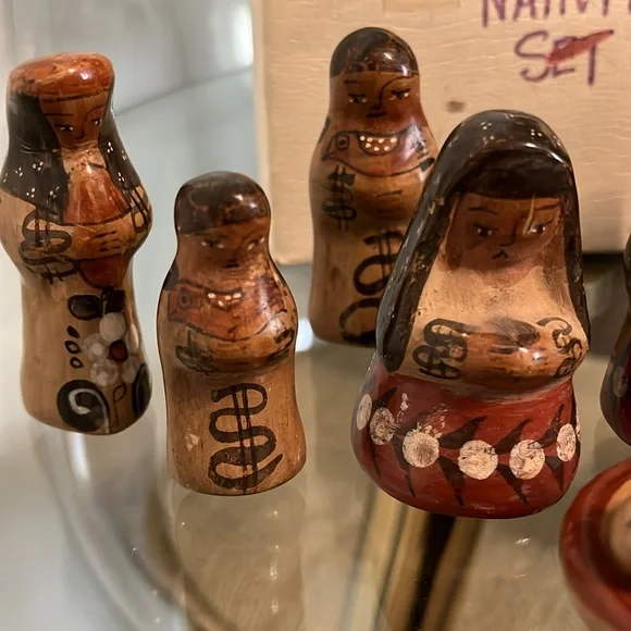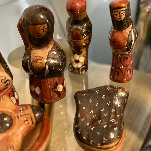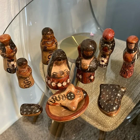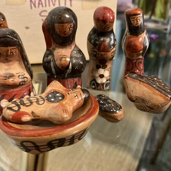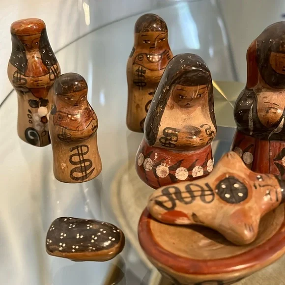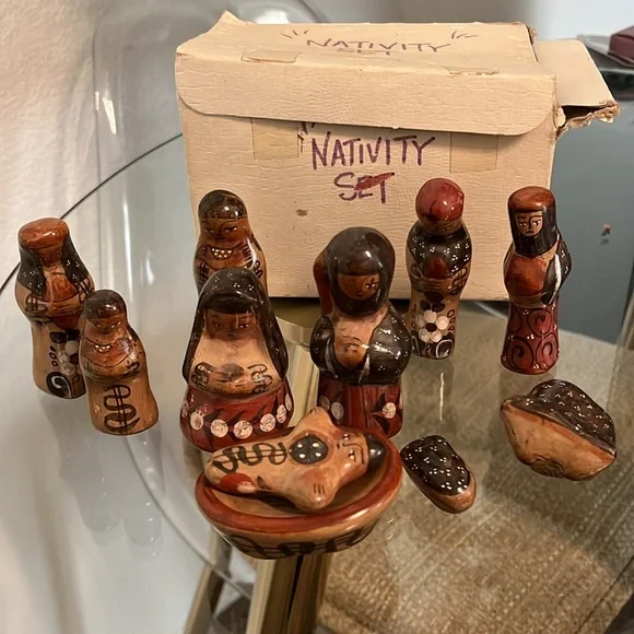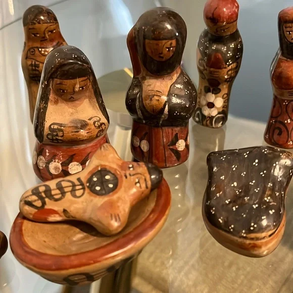 This beautiful vintageTonala Nativity set is a true work of art, handmade in Mexico with clay and hand painted withcolors. The set includes 11 pieces and depicts the classic Christmas scene of the birth of Jesus. The intricate details and unique style of this set make it a must-have for any collector or anyone looking to add a touch of Mexican culture to their holiday decor. Perfect for display or as a gift, this Nativity set is sure to bring joy and beauty to any home.Height from 3 in for kings, 2.75 in Joseph , Mary 2.0 in, shepherds & animals2in and lessManager is 2 in LTotal weight of all 11 piecesis less than 1 lb.All pieces in excellent/mint condition.Comes with original box