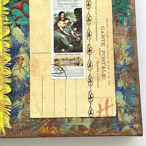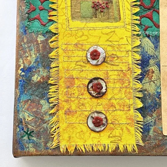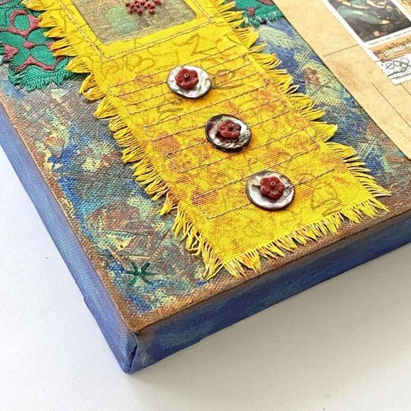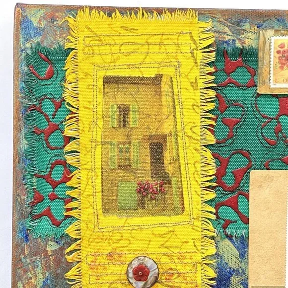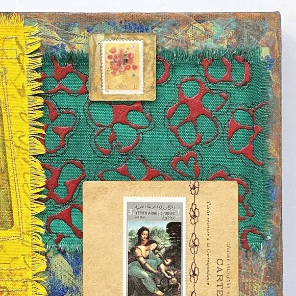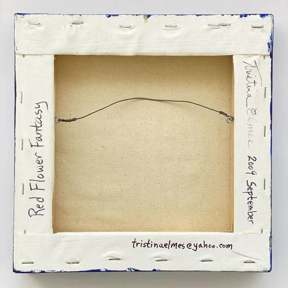 ‘Red Flower Fantsy’ is an exotic green, red, yellow and blue original one-of-a-kind handmade Mixed Media collage painting by Artist Tristina Dietz Elmes.This unique piece is created on a stretched canvas with hand dyed and painted fabric pieces punctuated with mother-of-pearl and red flower button beads along with other thread stitch play. The painting also features pretty vintage postage stamps.The artwork arrives signed by the artist and sealed in a protective plastic bag. Although the piece is not framed, the sides are painted and it is already wired, ready to hang.Name: Red Flower FantasyArtwork Size: 10 inches x 10 inches x 1 1/2 inchesSurface: Stretched CanvasMedia: Acrylic Paint, Fabric, Thread, Buttons, Image TransferMatted: NoFraming: NoSigned: YesCreated: 2009