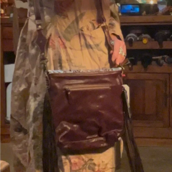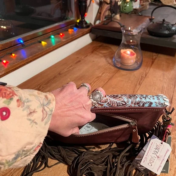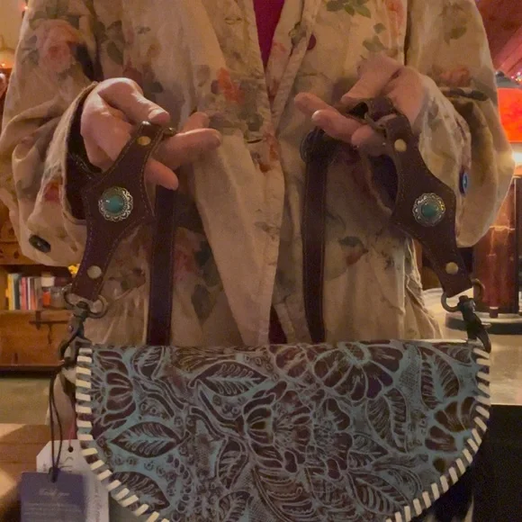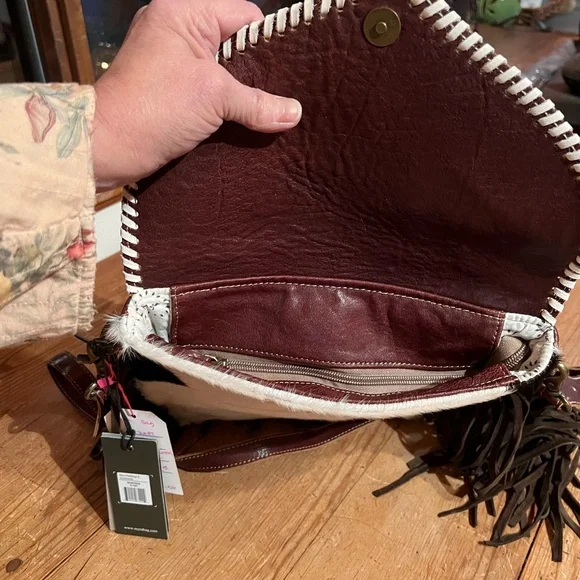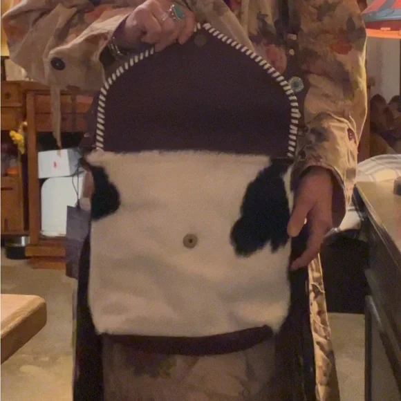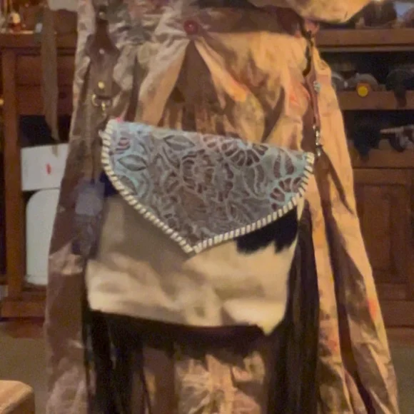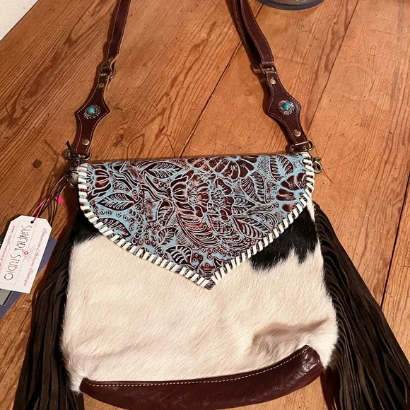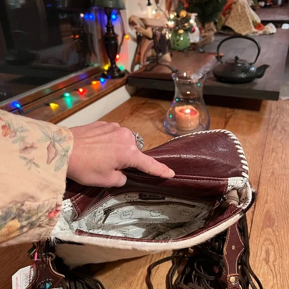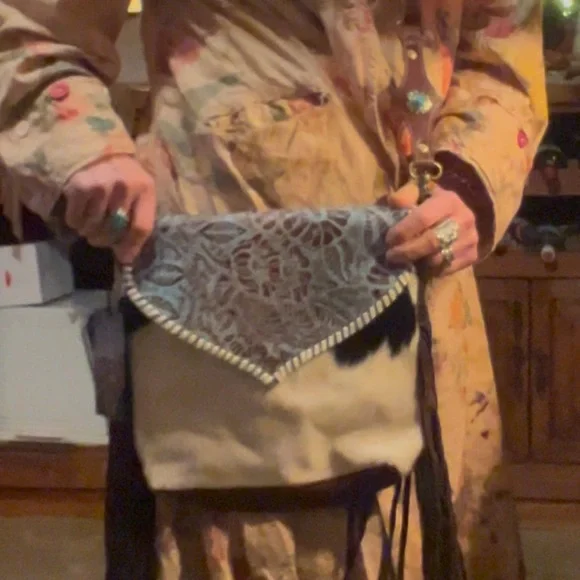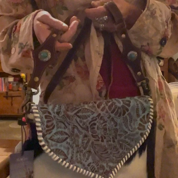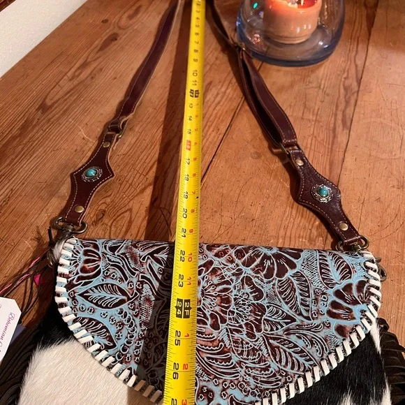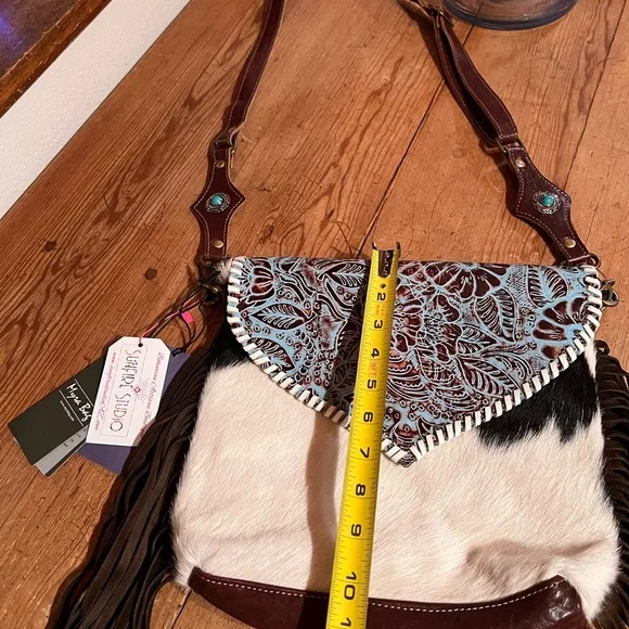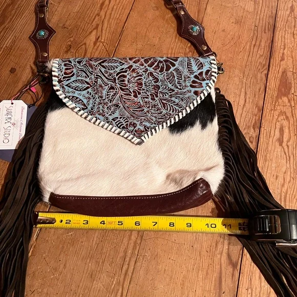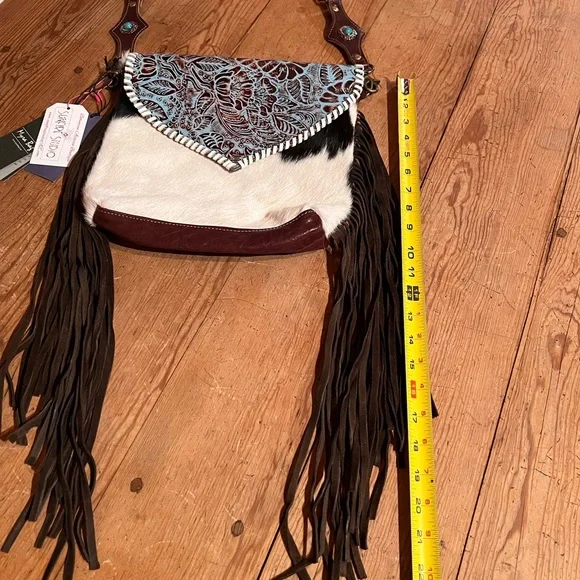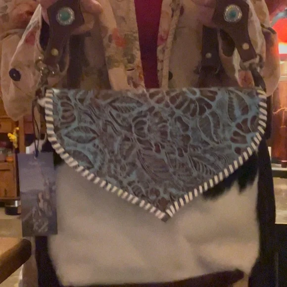 New With TagsA beautiful, stitched flap of hand-tooled turquoise leather, black and white hair-on hide front, and a back panel in rich bourbon chocolate leather, all come together in a timeless design. Long leather side fringe completes the look of this roomy bag, with includes a zipper-close top and detachable, fully adjustable leather shoulder strap. Simply amazing.This bag in this listing has mostly white hide with two small black areas (one on the upper left and one on the upper right). THIS IS THE BAG YOU WILL RECEIVE.MaterialHairon & LeatherDimensions (in inches)Width : 12Height : 10Shoulder: 22Depth : 2.5Care : Dry Clean only. Keep away from water
