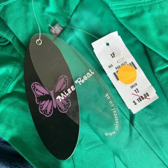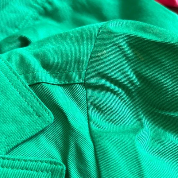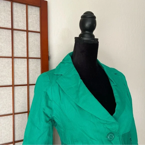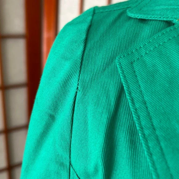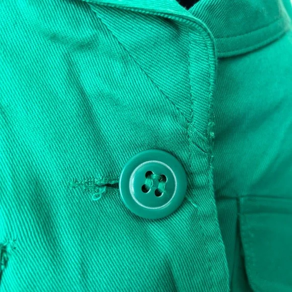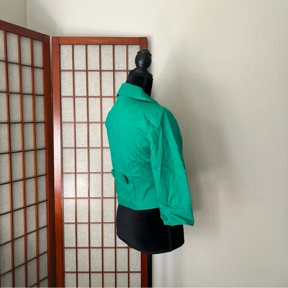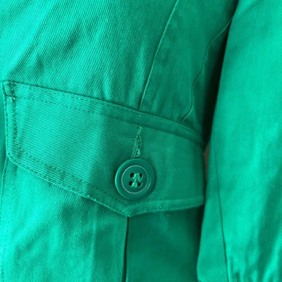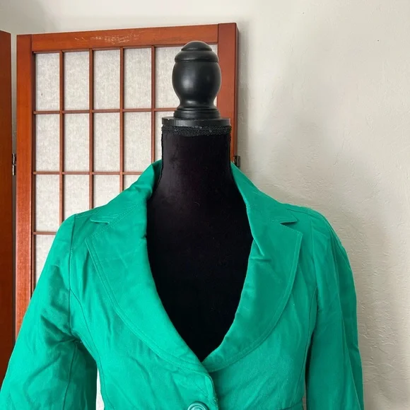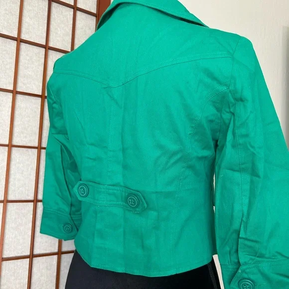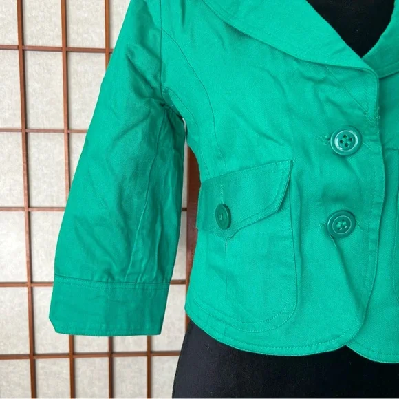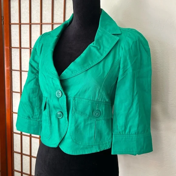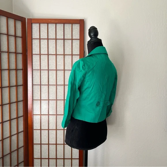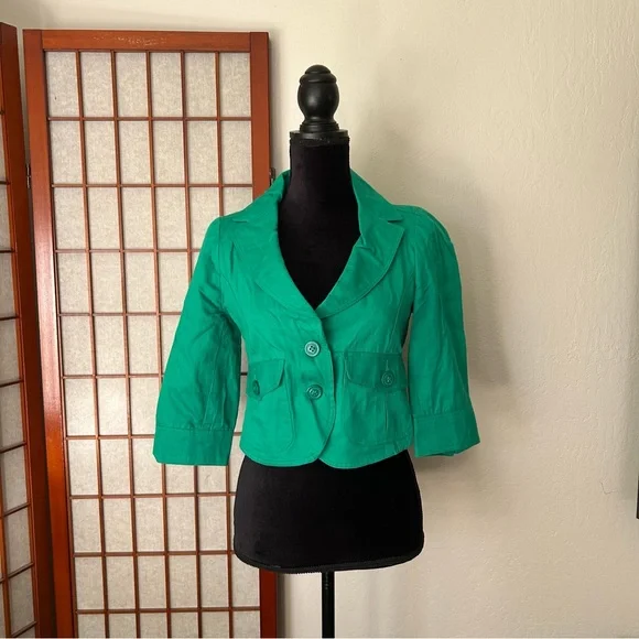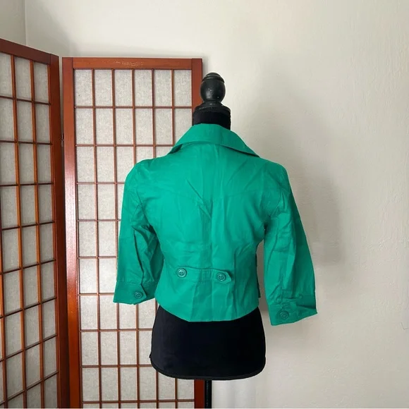 LF NWT Miss Real Y2K Spring ‘07 Kelly green cropped blazer, short sleeve, button cuffs, double button, button back accent. Slightest puff sleeve. Spots present on left shoulder. Messy seams and loose thread present. Size 12, would best fit a medium. Measurements:-Bust: 18”-Waist: 15.5”-Length: 19”-Sleeve Length: 16.5”*All measurements are taken with garment lying flat.