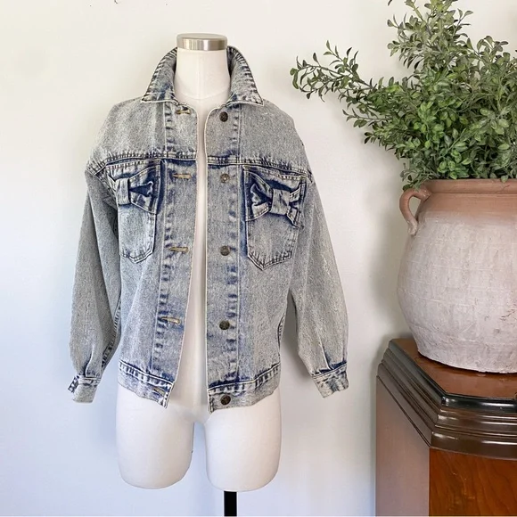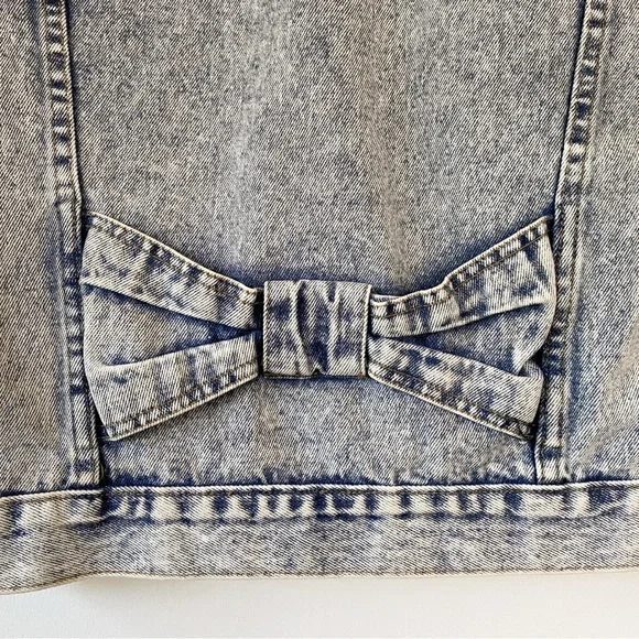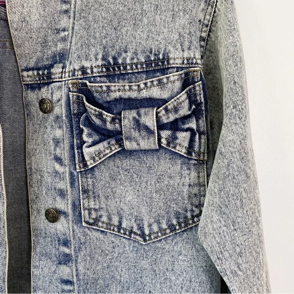 VINTAGE denim jacket featuring two pocket bows and one bow in the back. I bought this jacket at a high-end vintage store a few years ago. I sadly didn’t wear it hardly at all and it’s time to find it a happy home. Shoulder width 19”Jacket length 22 1/2”Sleeve length starting from under the collar to the end of the sleeve 26”Smoke free environmentFinal saleShips from Southern CaliforniaNo returns
