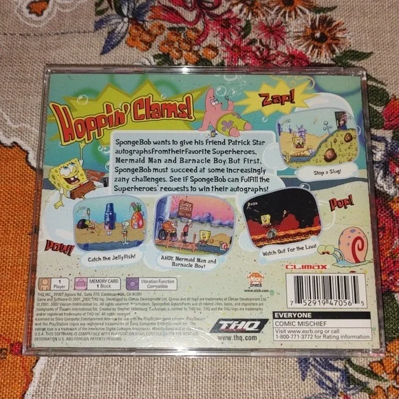 SpongeBob SquarePants: SuperSponge is a 2001 2.5D platform game developed by Climax Development and published by THQ. The game is based on the Nickelodeon cartoon series of the same name. It was released for the PlayStation on September 20, 2001, and for the Game Boy Advance on November 8, 2001.Great pre-owned conditionSee pictures for the overall conditionPrice is fixed, firm and non-negotiablePlease No offersNo need to send offers, we would "politely & promptly" decline any offers you sendShipment would be made earlier if payment is received and cleared in timeWe encourage our buyers to take time and look at the uploaded pictures because we do not accept returns It comes from a non-smoking and pet free homeThanks for your patronageWe appreciate your business #613Obodo