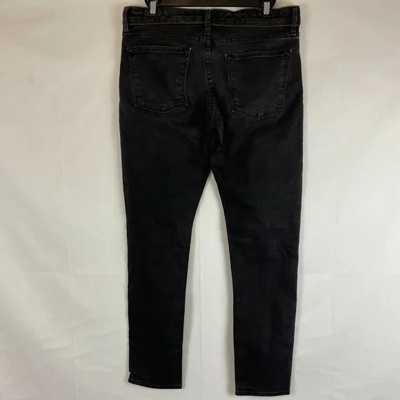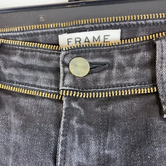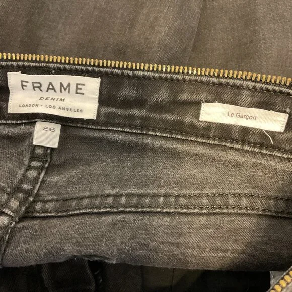 Frame Le Garcon Jeans 26 Muted Black Zipper Trim Slim Tapered LegBrand: FrameType: JeansStyle: Le GarconColor: Muted BlackSize: 26Details: Zipper Trim, Slim Tapered LegMaterial: Cotton/Polyester/LycraCleaning Care: Machine wash cold/tumble dry lowMeasurements: 16" across waist (32" doubled), 9" rise, 28" inseamCondition: Pre-Owned: No rips, stains, or tearsFrom a smoke-free home! Thank you!