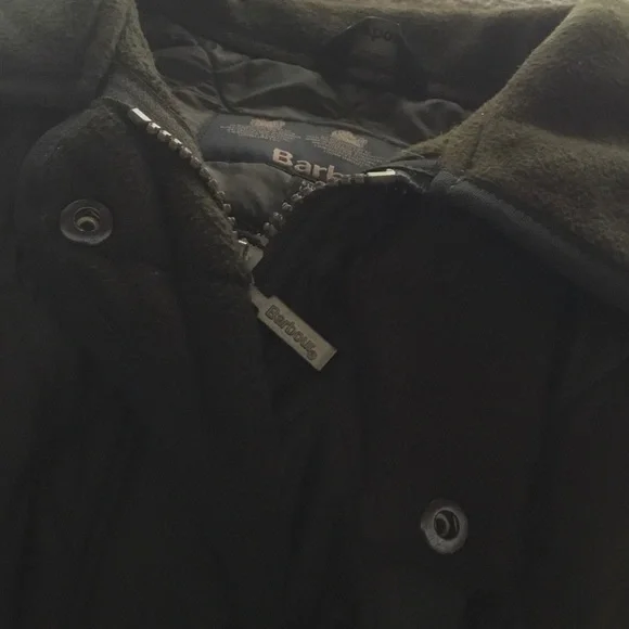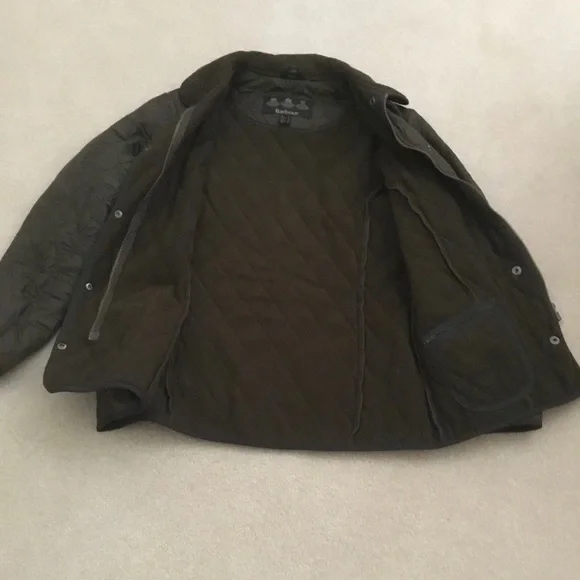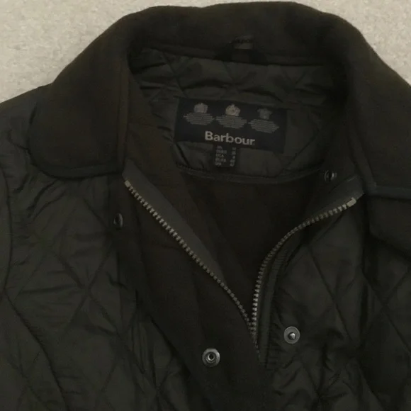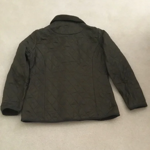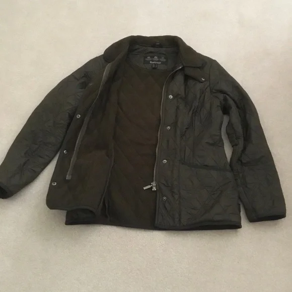 Ladies Barbour Polar-Quilt Jacket, US Size 8, (UK size 12) Underarm = 41”, Waist = 38”, Hip = 41”, Heavy Duty Zipper with 5 snaps plus neck snap flap. 2 Front slash pockets, one interior Zipper pocket. Outer = 100% Polyamide, Inner = 100% Polyester, Dark Olive Green, Lightweight but warm fleece jacket. Great condition.