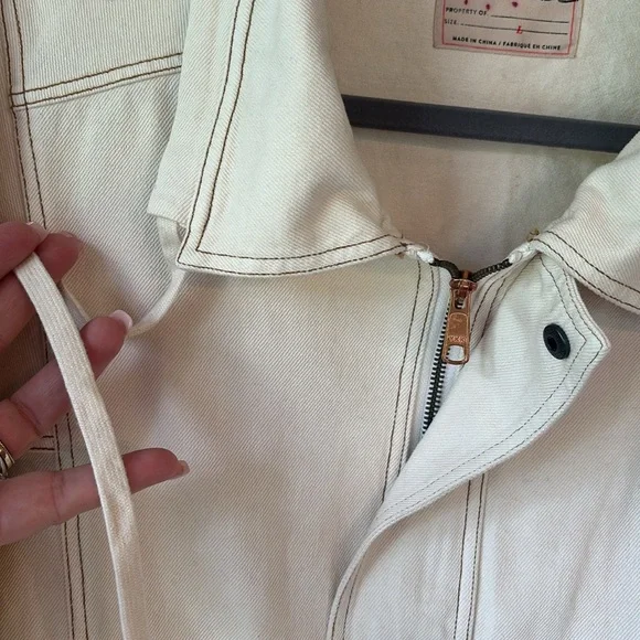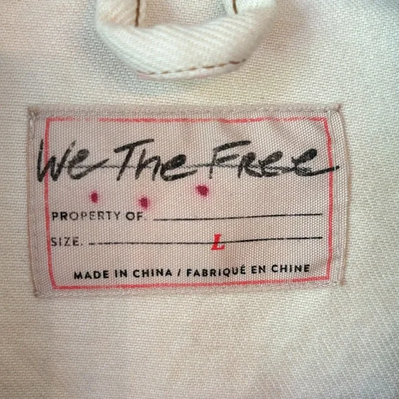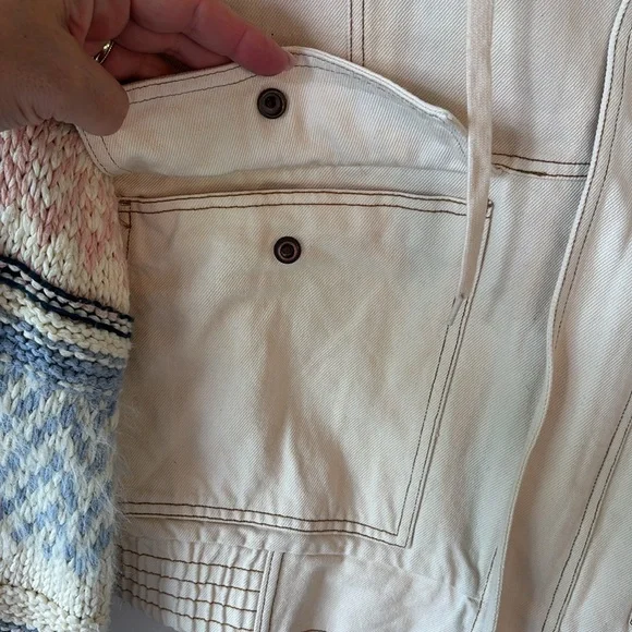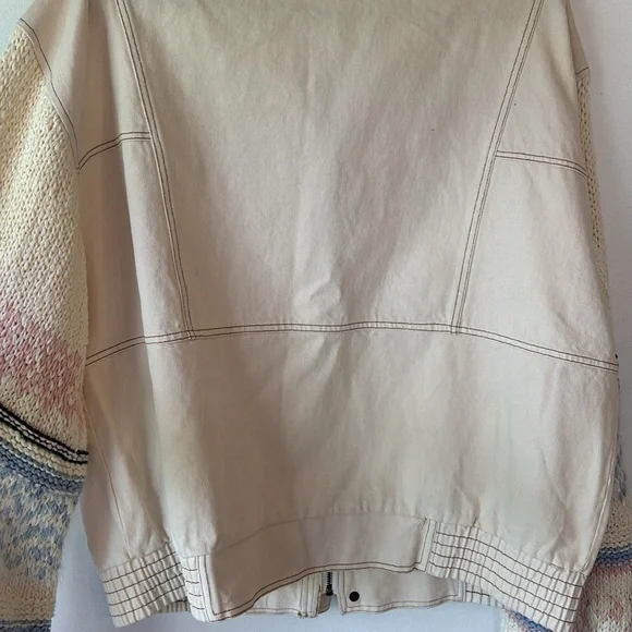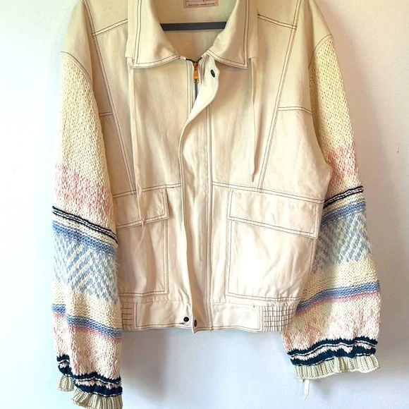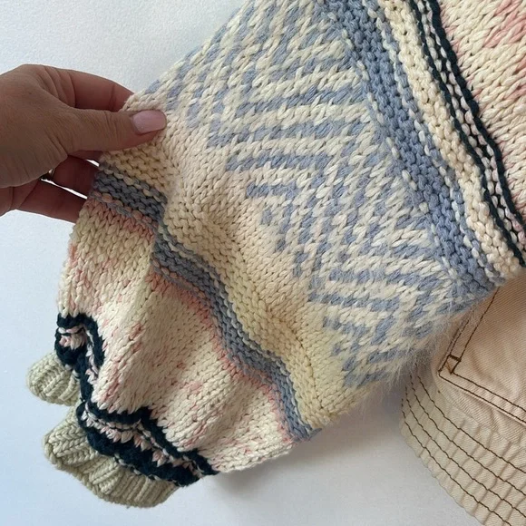 Elevate your wardrobe with this gorgeous piece from We the Free, such a chic oversized denim jacket featuring unique handknit fairisle patterned sweater sleeves in accents of blue, teal, and blush. The lantern sleeves are finished with drawstring pulls at the wrist for a perfectly stylish fit! Truly unique and the ultimate in edgy, boho style! Never worn, women's sz L